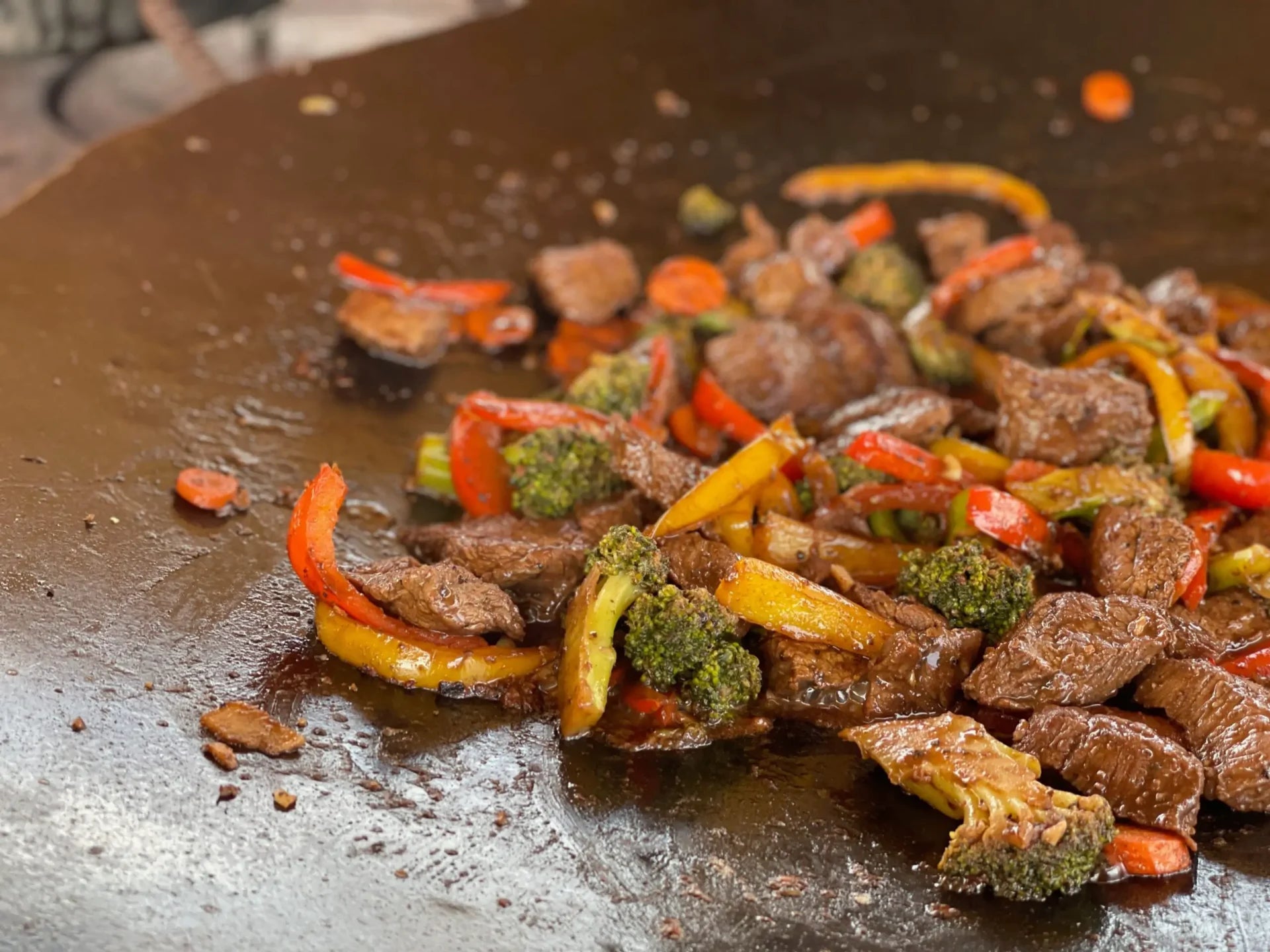 When the meat is cooked and the peppers are al dente, remove the meat and peppers from the wok. Don't wipe it down. Toss the broccoli and carrots into the wok until all the water steams off and the carrots get blackened a little. Then, toss those back into the bowl. In a minute, we are going to marry all of this back together with a delicious, homemade stir-fry sauce.