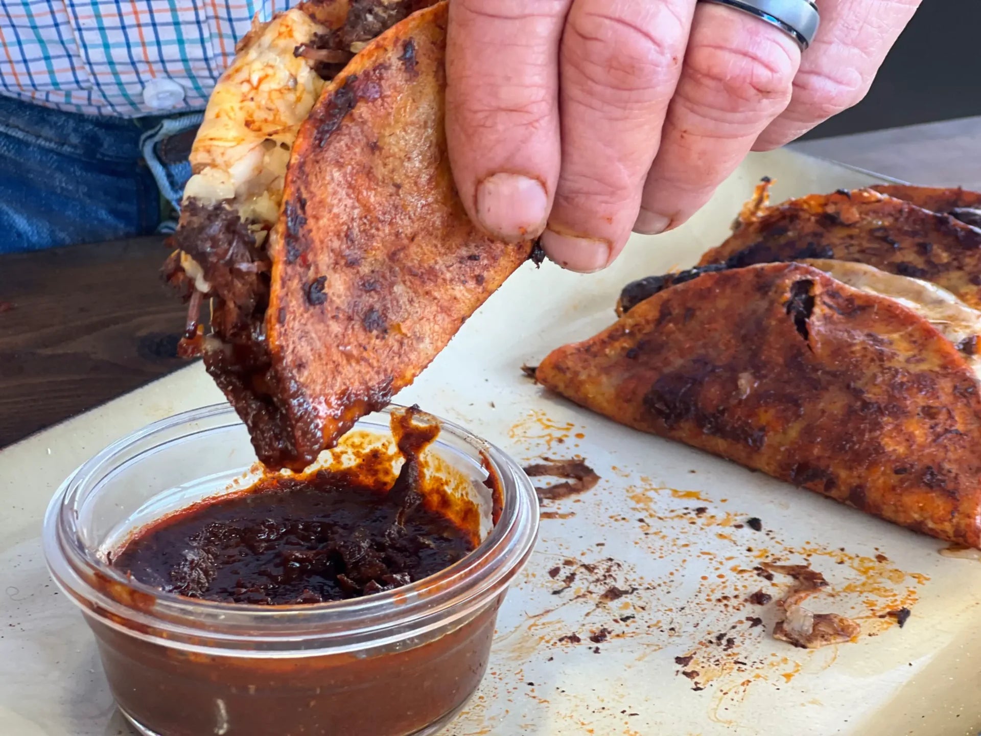 - Take a tortilla and dip in the red broth, to coat. Place in a cast iron skillet over medium-low heat, and cook for about 1 to 2 minutes, or until it warms through. Flip and add about 2 heaping tablespoons of meat to one side of the tortilla, followed by 1 to 2 tablespoons each of the Oaxaca and mozzarella cheeses. Fold the tortilla over and mash slightly with the spatula. Continue cooking until the cheeses have melted and taco has warmed through. Place in a warm oven and repeat with the remaining ingredients.