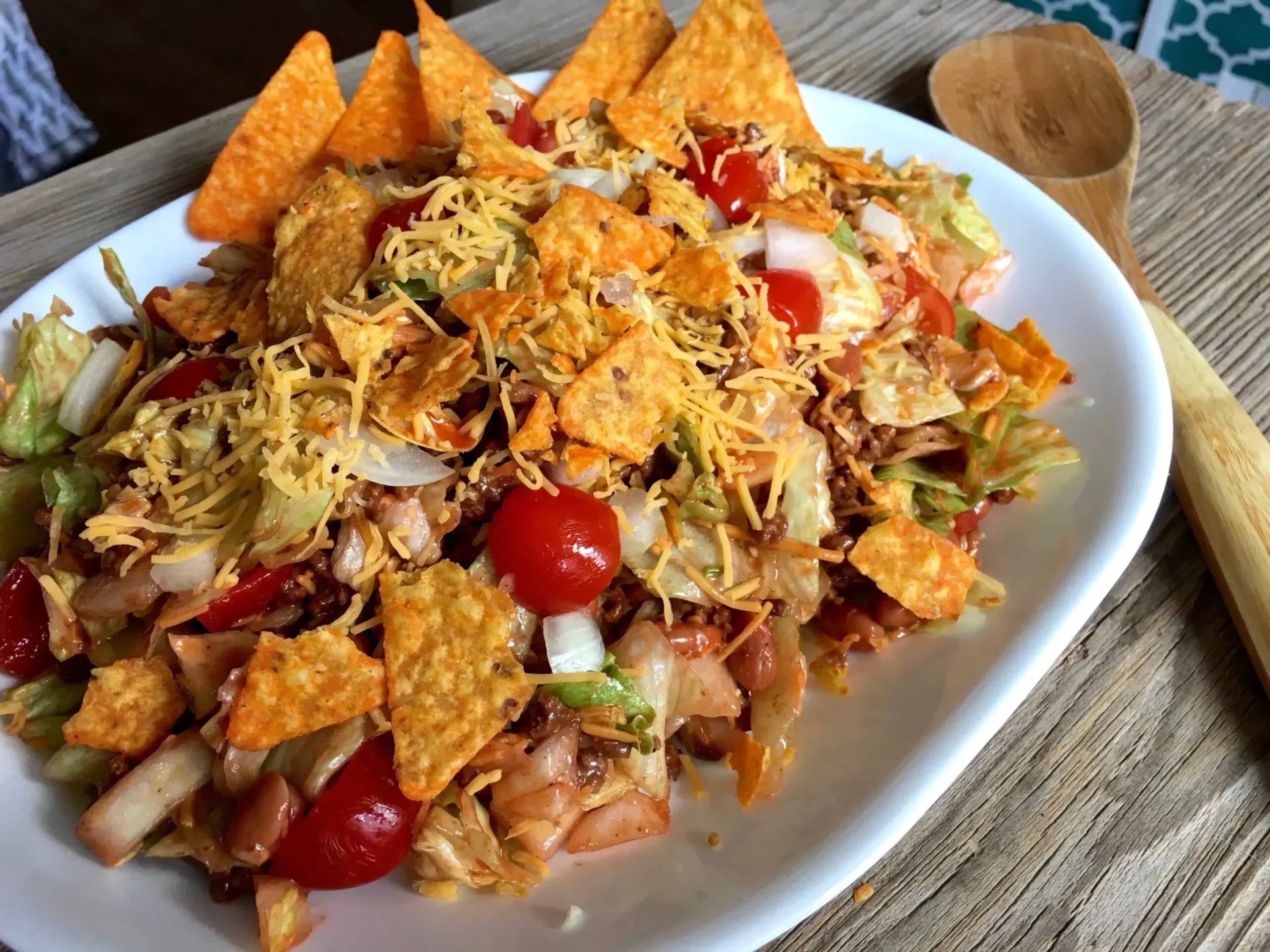 - Sprinkle with additional cheese and generously top with the crushed Doritos or corn chips. Serve immediately.