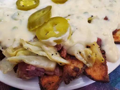 Crisp, crunchy potato wedges topped with left over Corned Beef and Cabbage smothered with a green pepper, onion and garlic provolone sauce. It don't get much better than this! Not unless you top that off with sliced jalapeno and or diced green onions. ooohh, maybe some bacon crumbles! This recipe is so versatile. You can substitute the potato wedges for waffle fries. This creamy cheese sauce will have your taste buds doing the Irish Jig!