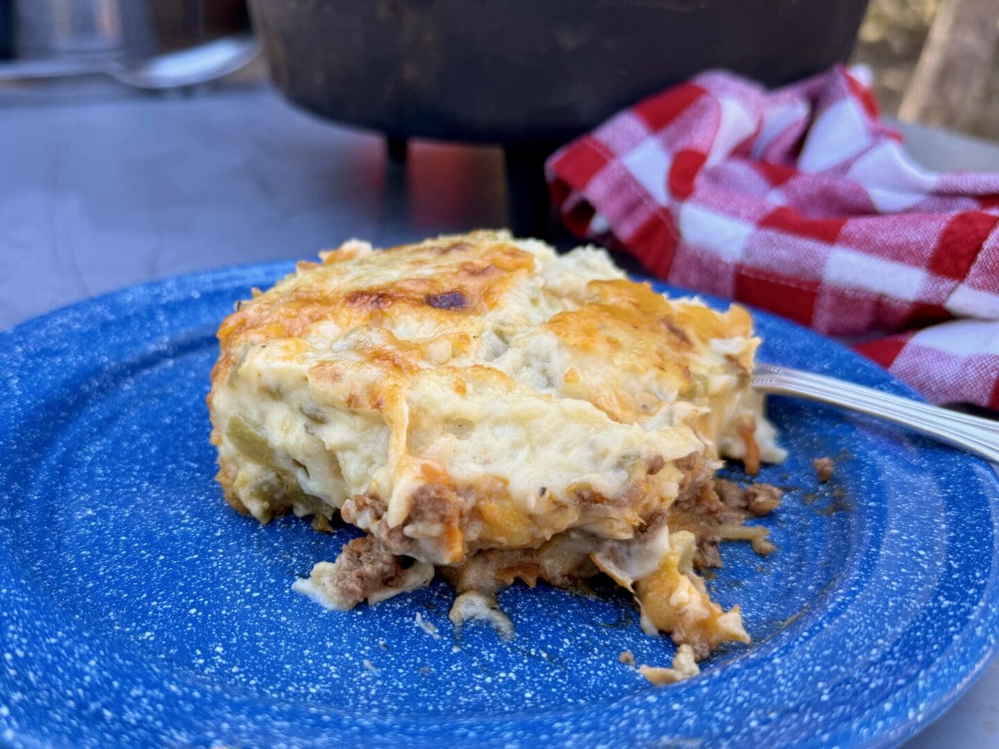 - You can keep the meat in the skillet, or transfer to a 9x11-inch casserole dish, or 10-inch Dutch oven. Evenly top with the mashed potatoes. With a fork, gently press down into the potatoes and pull up to make slight peeks around the top. Evenly top with the parmesan cheese.