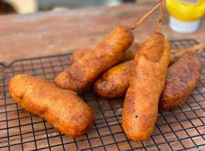 Folks, today I'm going to teach you something that will keep you out of the frozen food section and that will beat anything you've ever eaten at a state fair. I'm talking about Corn Dogs, one of the most American foods we can think of, and can find at any state fair in the country, from Texas to Minnesota. Throughout the years, they've been made all kinds of different ways, but to me, a good corn dog always has a corn meal base.