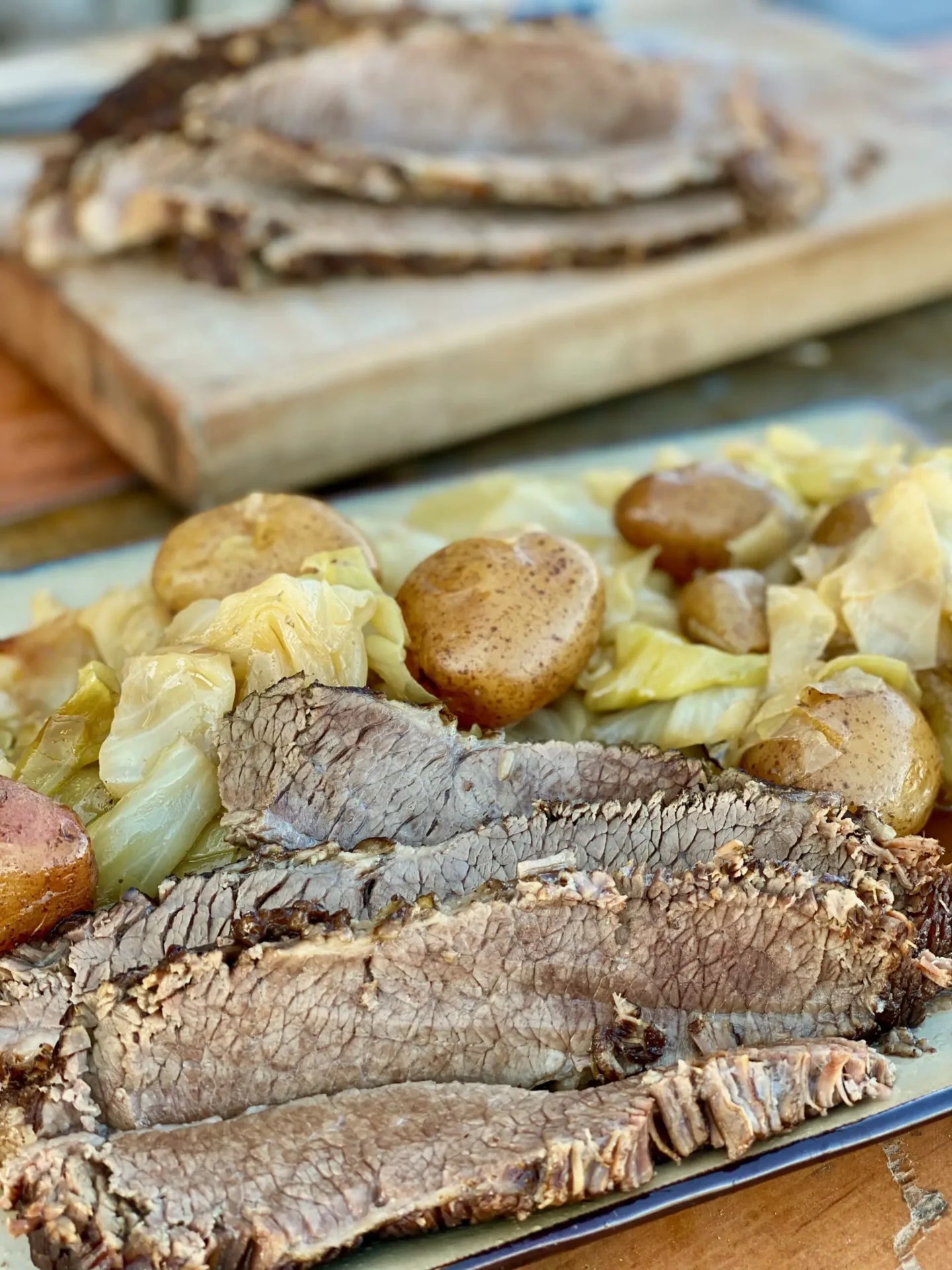 - Remove the brisket and let cool slightly. Cut against the grain. Serve hot with cabbage and potatoes.