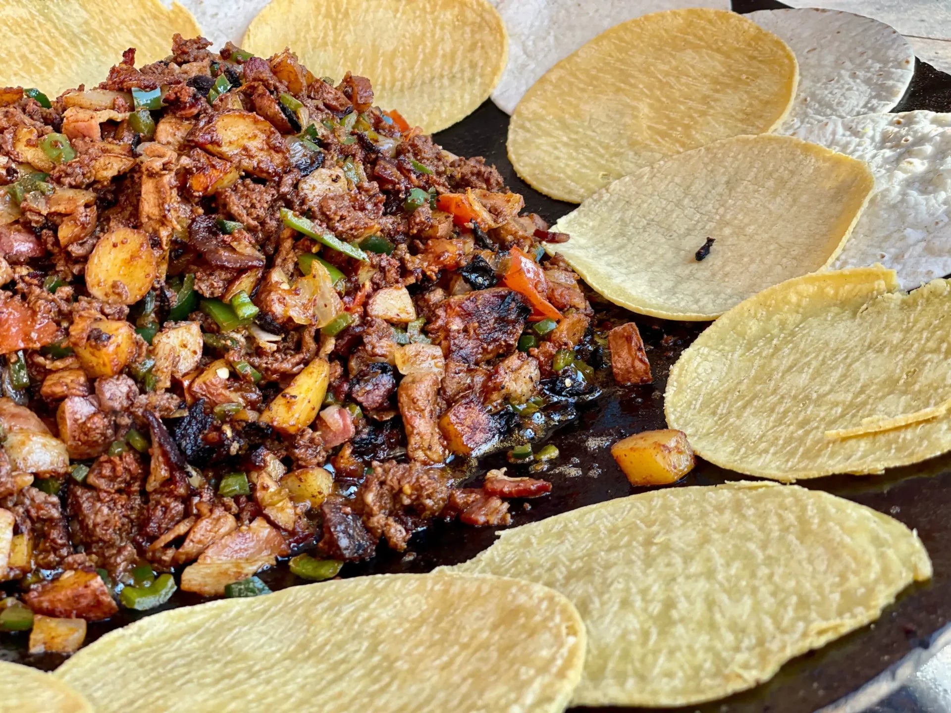 - Bring all the ingredients back to the center of the disc and mix well. Cook for about 4 minutes, to incorporate the flavors, stirring occasionally. Mound the meat mixture up in the middle of the disc and place corn and/or flour tortillas around the outside edge of the disc to warm. Serve immediately with your favorite toppings.