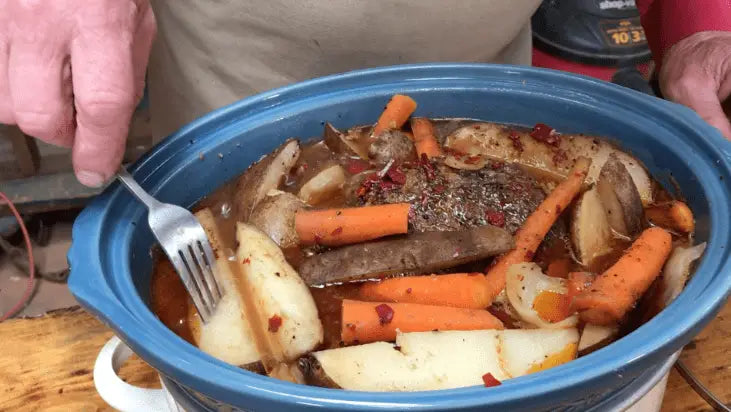 Cook on high for about 6 hours or on low for about 8 hours. Depending on the size and thickness of the roast you may need to alter your cooking time. I checked the roast about 5 hours in and reduced it to low for an additional 1 – 1 ½ hours. Cook until the veggies are done and the meat is fork and pull apart tender.
