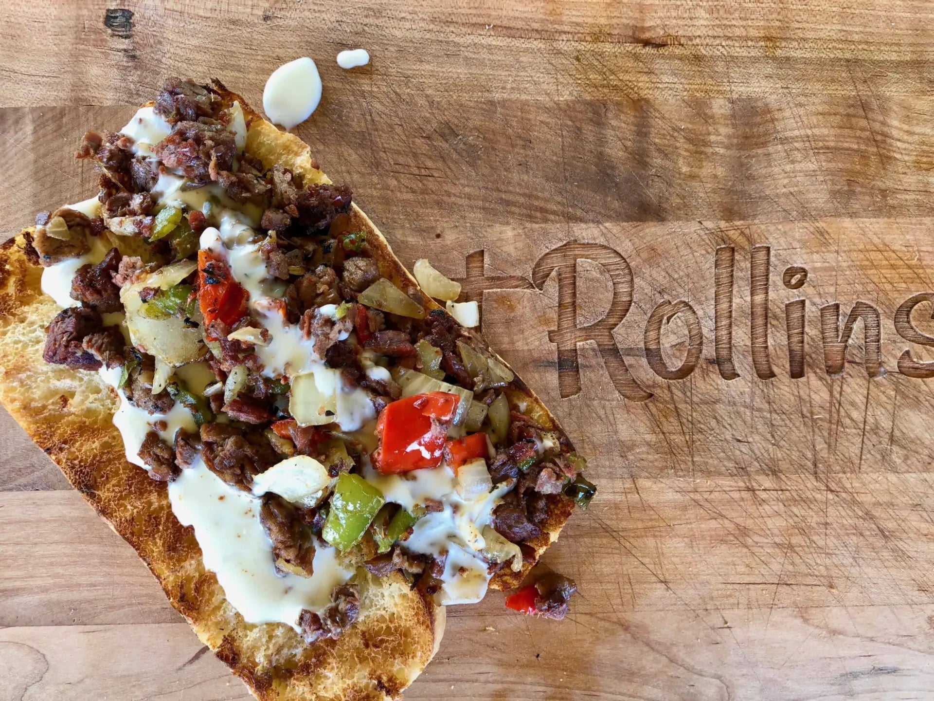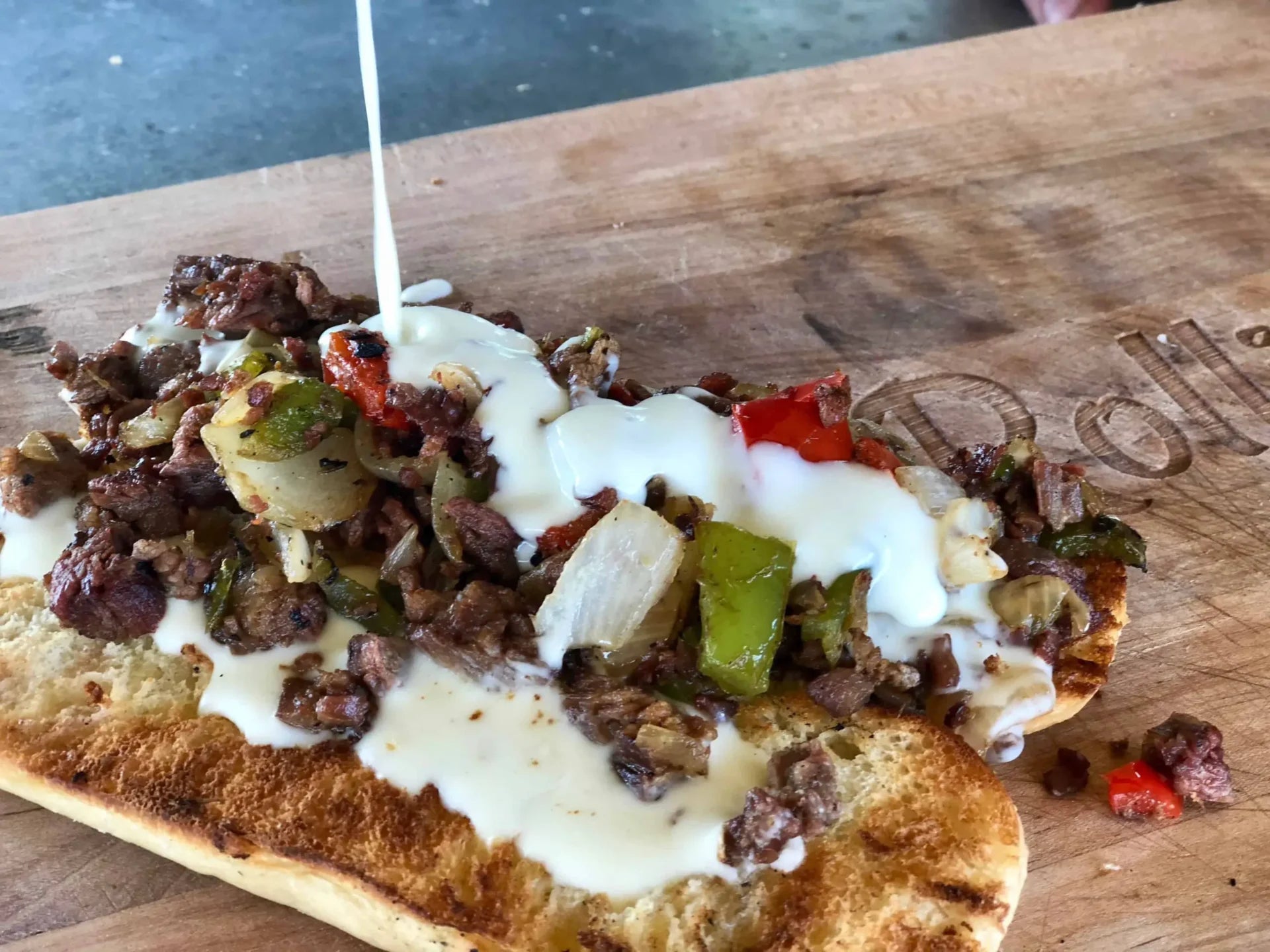 Steak and pepper sandwich with sauce on wood.