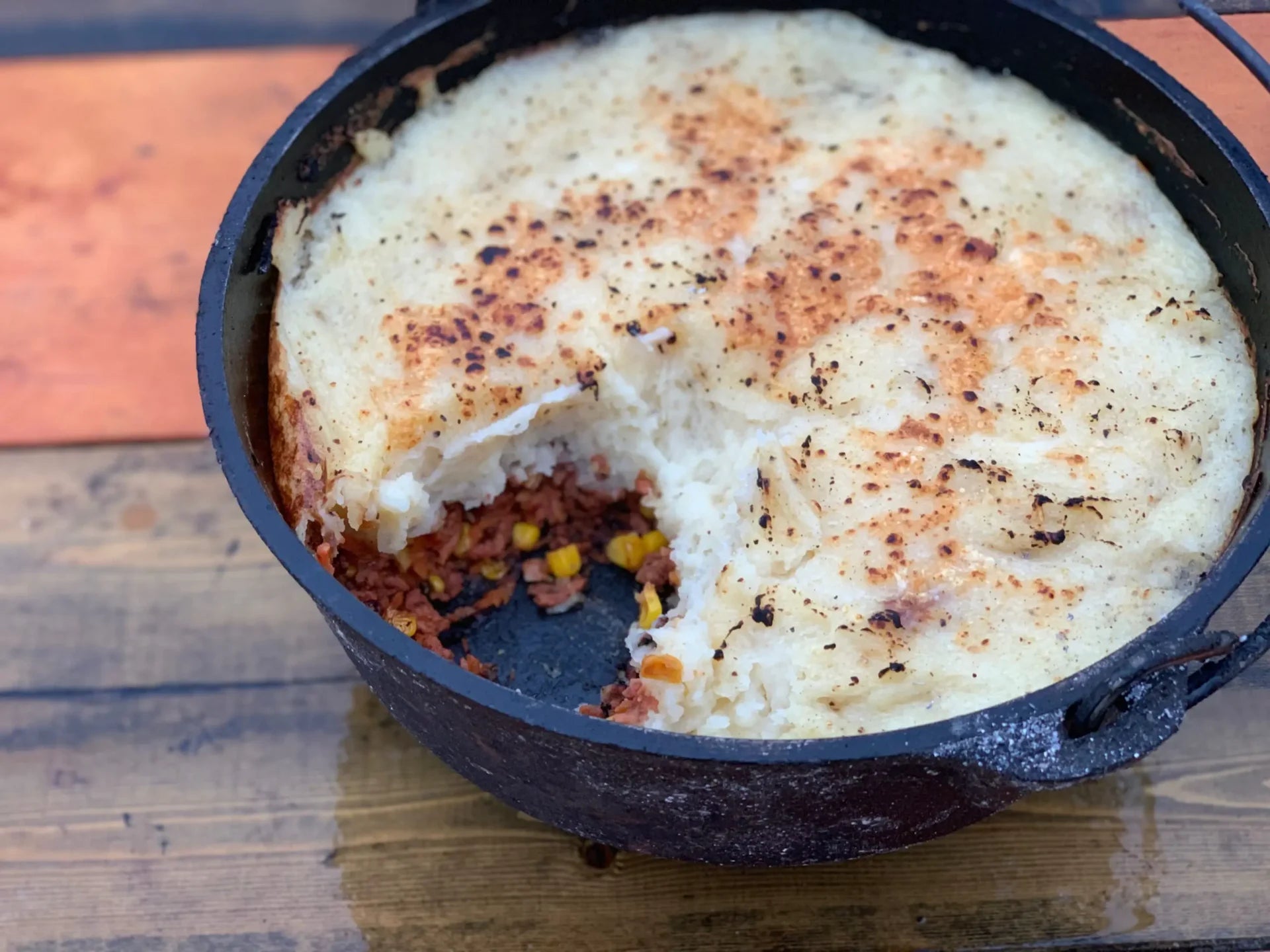 Top the beef mixture with the mashed potatoes. If cooking outside, transfer the meat mixture to a greased 10-inch Dutch oven and top with the potatoes. Smooth the top of the potatoes evenly with a spoon. With a fork, lightly press into the potatoes and pull up to create slight peaks around the top.