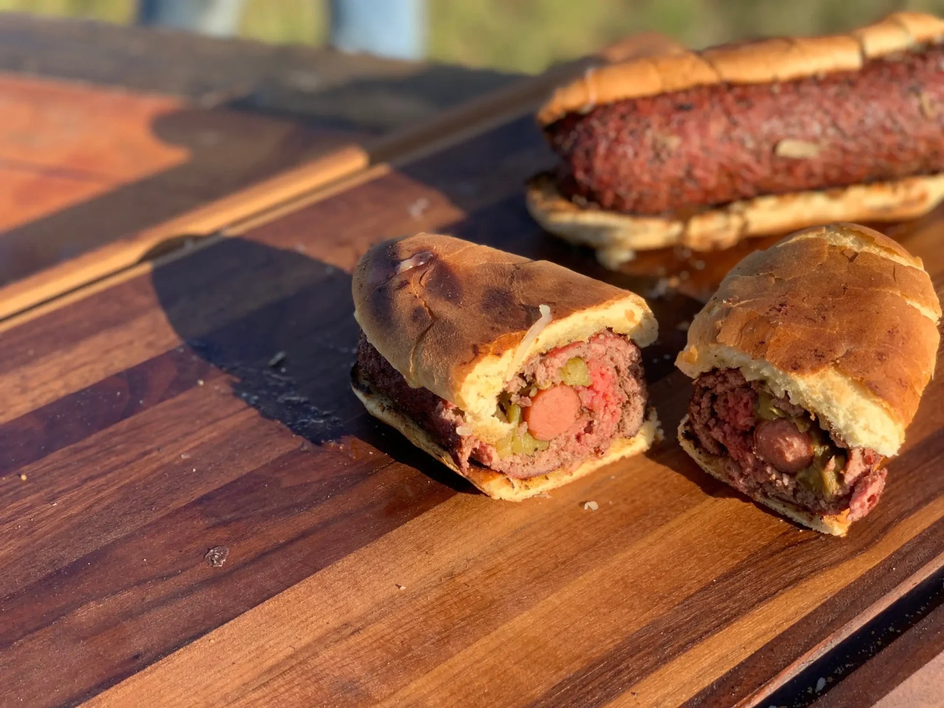 The All-American Burger Dog is a hot dog wrapped in a green chile and hamburger meat and grilled to perfection. Serve on a bun with all of your favorite fixin's!