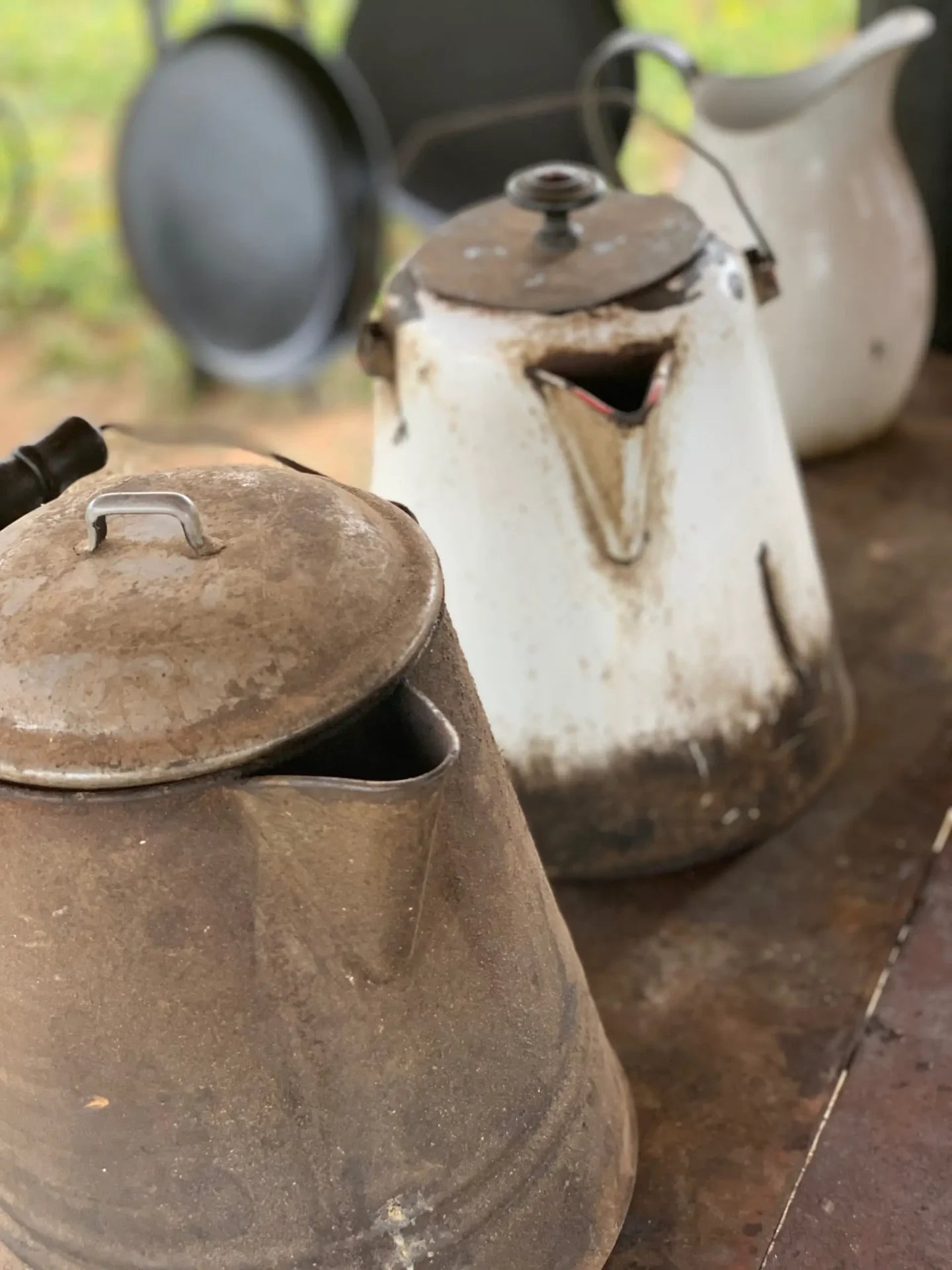 Every once in a while, you can find the big ol' camp pots like I have on the wagon at antique stores, junk shops and sometimes eBay. But, be careful because some of those old coffee pots will have holes in the bottom. Hold them up to the light to make sure you can't see any holes.