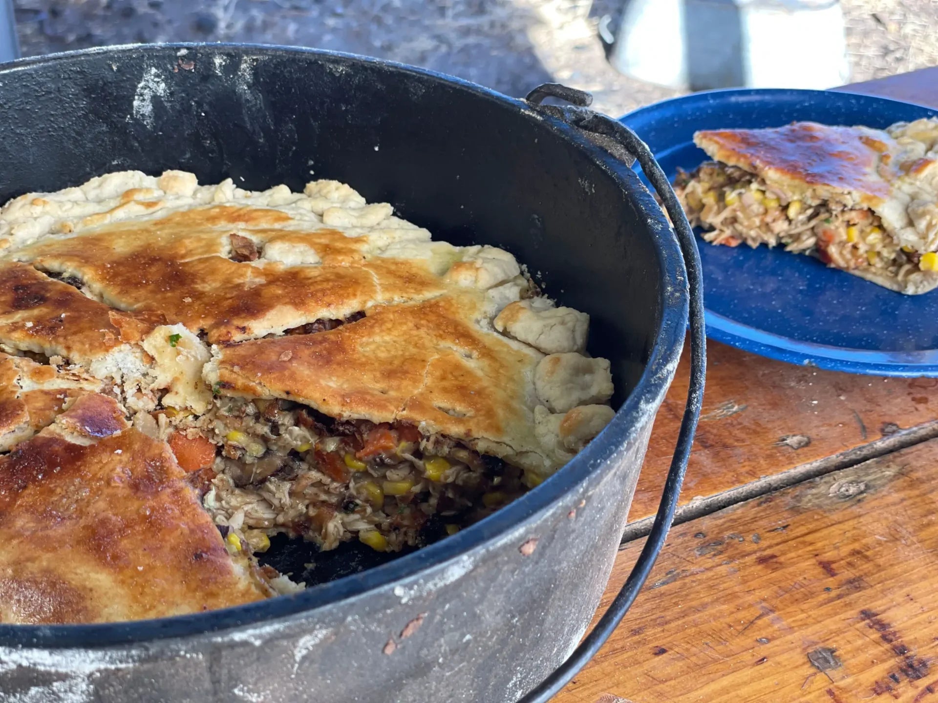 The very last step before you place the pot pie over the fire or in the oven is to brush the top of the pie with an egg wash. This will help the crust turn golden and delicious.