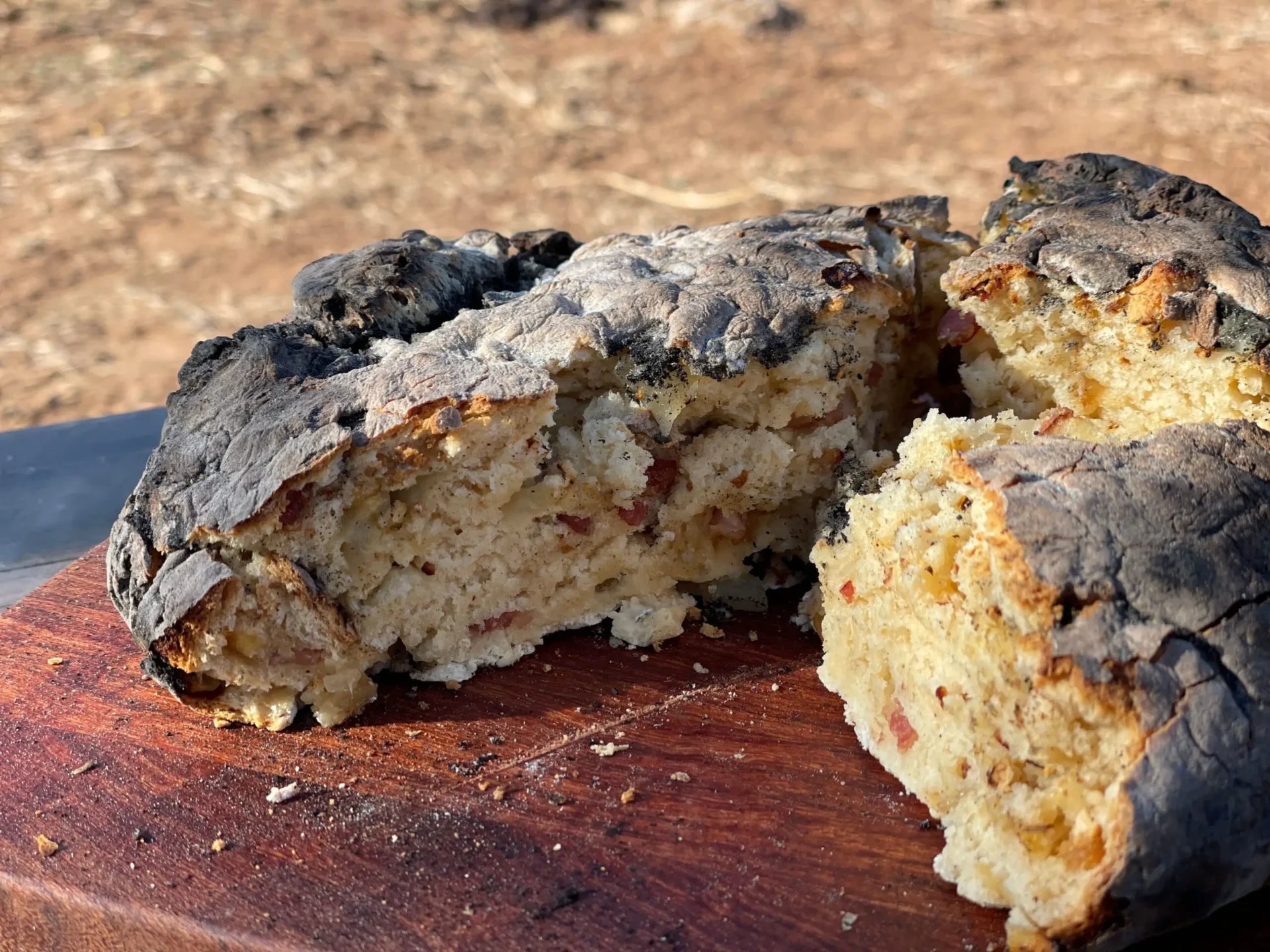 Place the flour-coated dough in the center of the ashes. Cover over the top of the damper dough with some hot ash and let sit for about 45 minutes. It's done when you thump it and it sounds hollow.