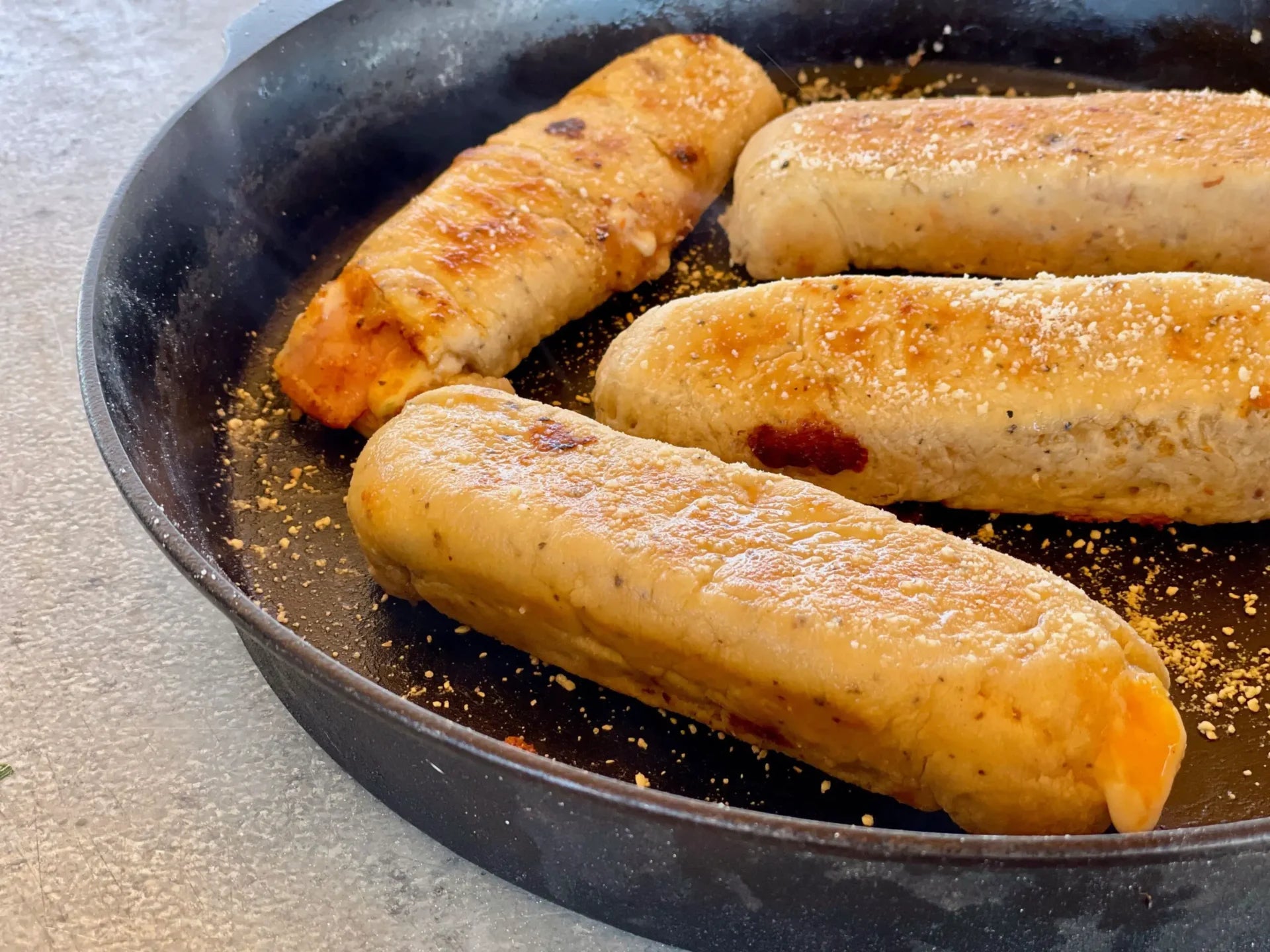 - Place the hot pockets, seam side down, in the skillet. Fry for about 3 to 4 minutes on all sides until lightly crispy and golden brown. Remove from the skillet and place on a wire rack, brush with butter/garlic mixture and sprinkle with Parmesan cheese. Serve warm.