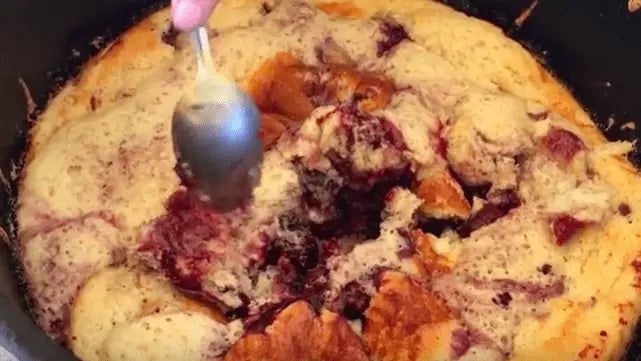 - Pour the batter in the Dutch oven. Evenly top with the fruit and juice.