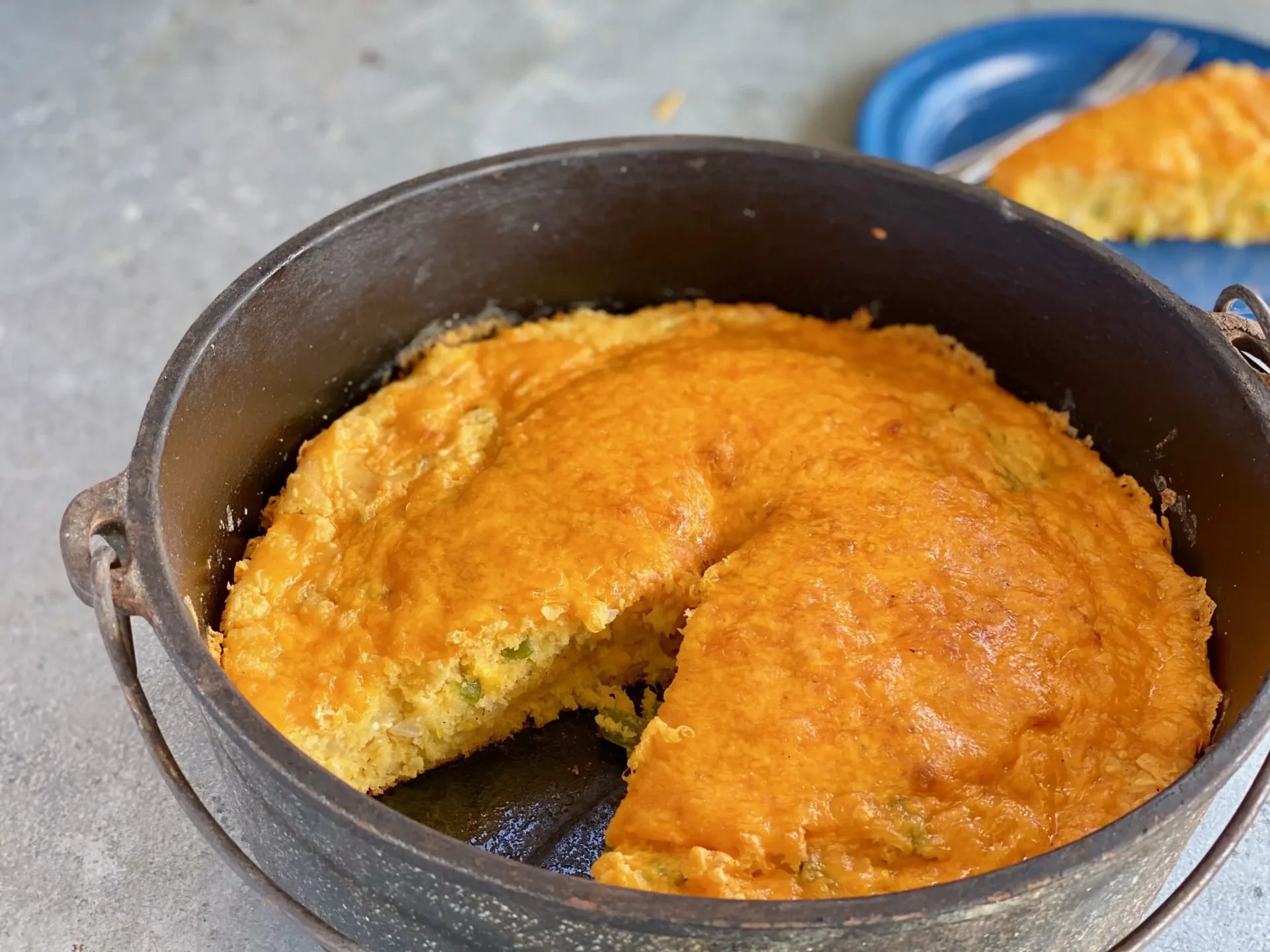 Folks, I'm cooking this in a 12 inch dutch oven, but if you're cooking it in the house you can cook it in a cast iron skillet or 9x13 inch casserole dish in the oven. I just like that crust that cast iron gives to cornbread.