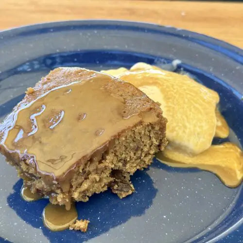 Sticky toffee pudding is what us Americans call “cake.” In the UK, they use treacle, which is very similar to Blackstrap molasses. We will prepare a molasses cake with rehydrated chopped dates, mix a toffee sauce, and pour the sauce over the cake. It’s easy and delicious!