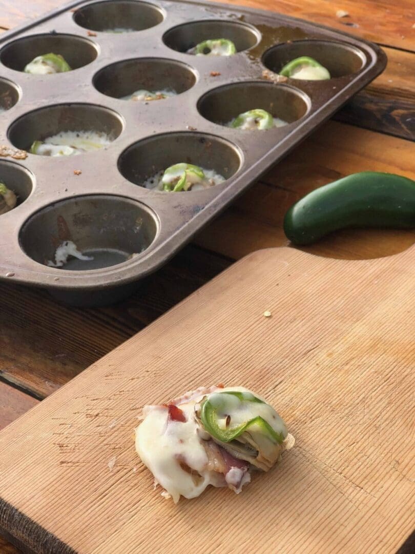 - Place 1 crumbled Ritz cracker on the bottom of each muffin. Sprinkle the tops with pepper jack cheese (about 1 to 1 ½ cups). Top with the bacon followed by an oyster and 1 -2 jalapeno slices.
