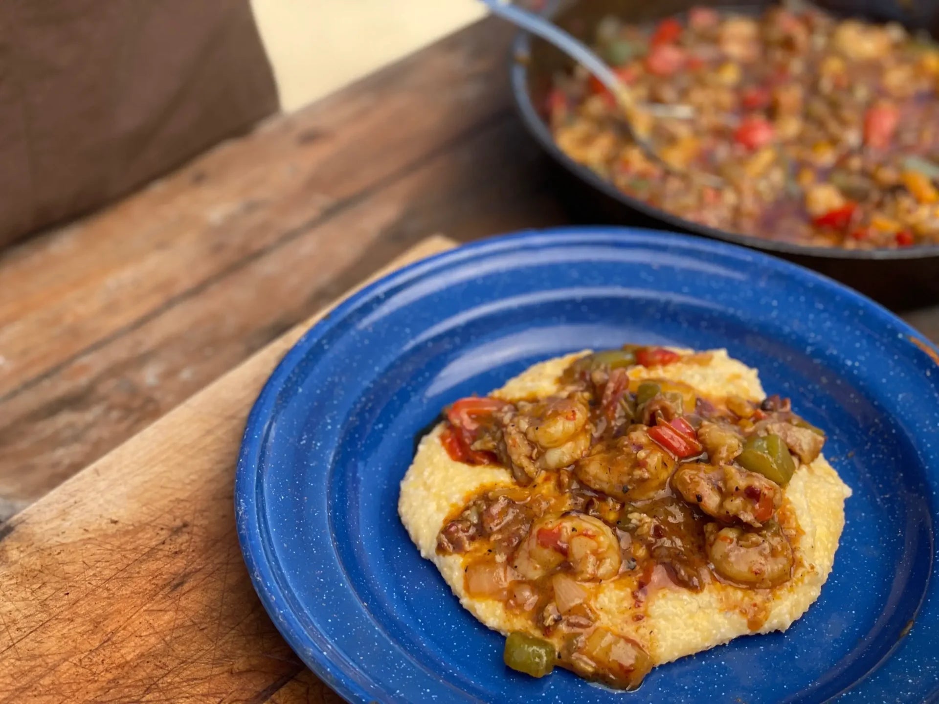 Hello to you from the backyard, where today we are cooking up some delicious shrimp & grits with a cowboy twist.