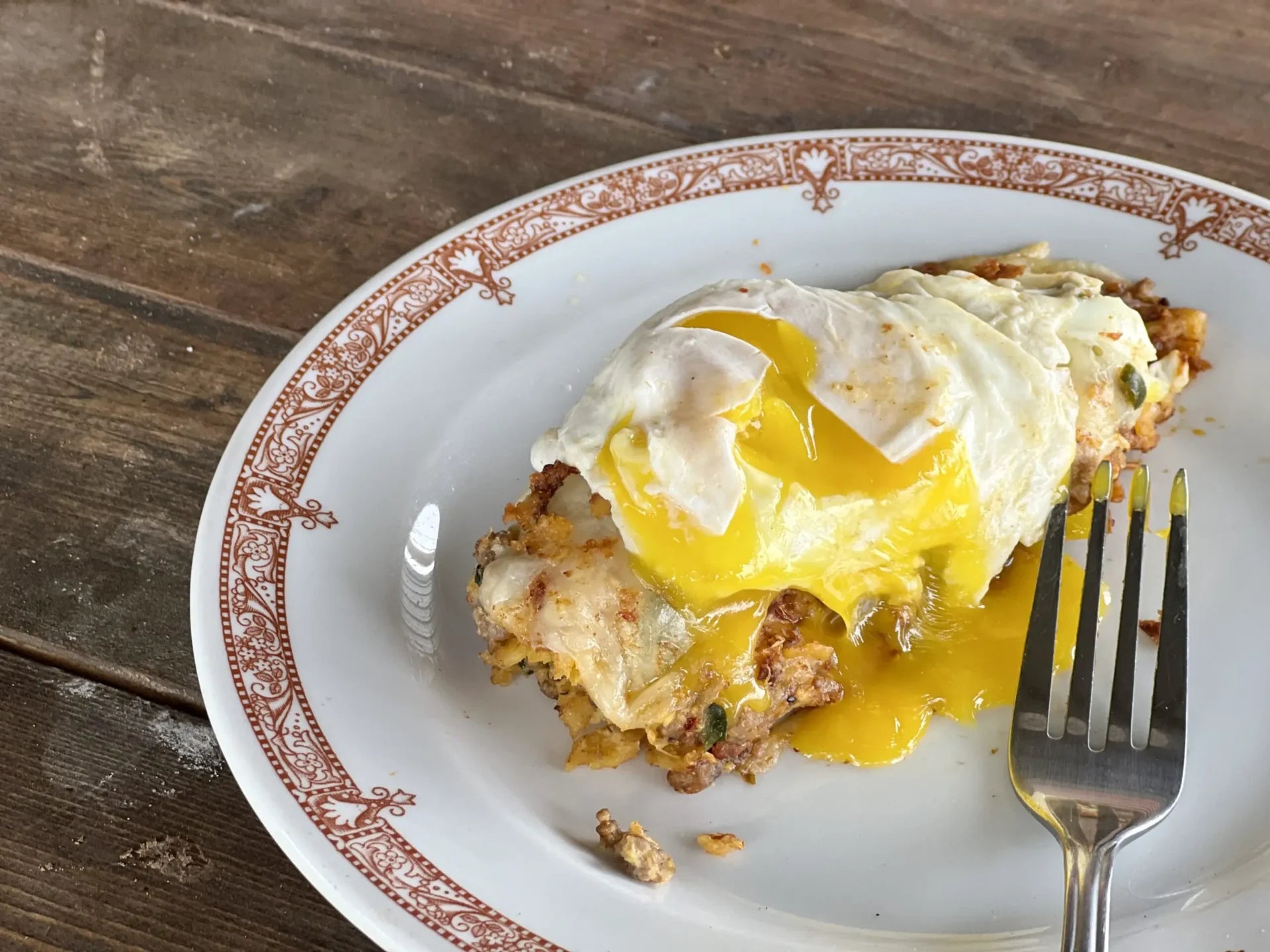 Pour the remaining salsa over the top of the enchiladas and evenly sprinkle the remaining meat mixture evenly over the top. Bake for 30 minutes. Remove the dish from the oven and sprinkle on the cheeses. Crack the remaining 5 eggs over the top.
