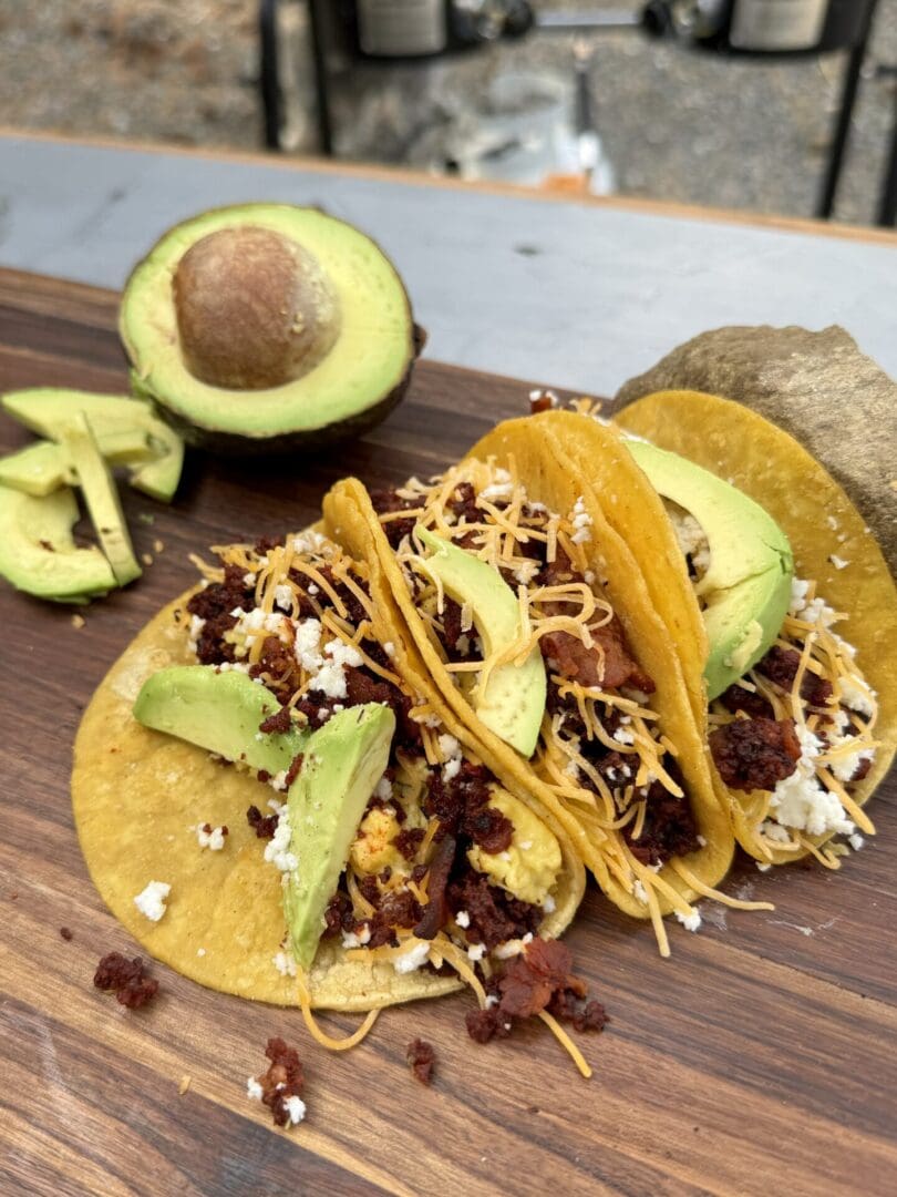 - To assemble the tacos: add about a tablespoon of shredded cheddar cheese down the middle of a tortilla, top with eggs, chorizo, more cheddar cheese and queso fresco. Top with avocado or salsa, if desired. Serve warm.