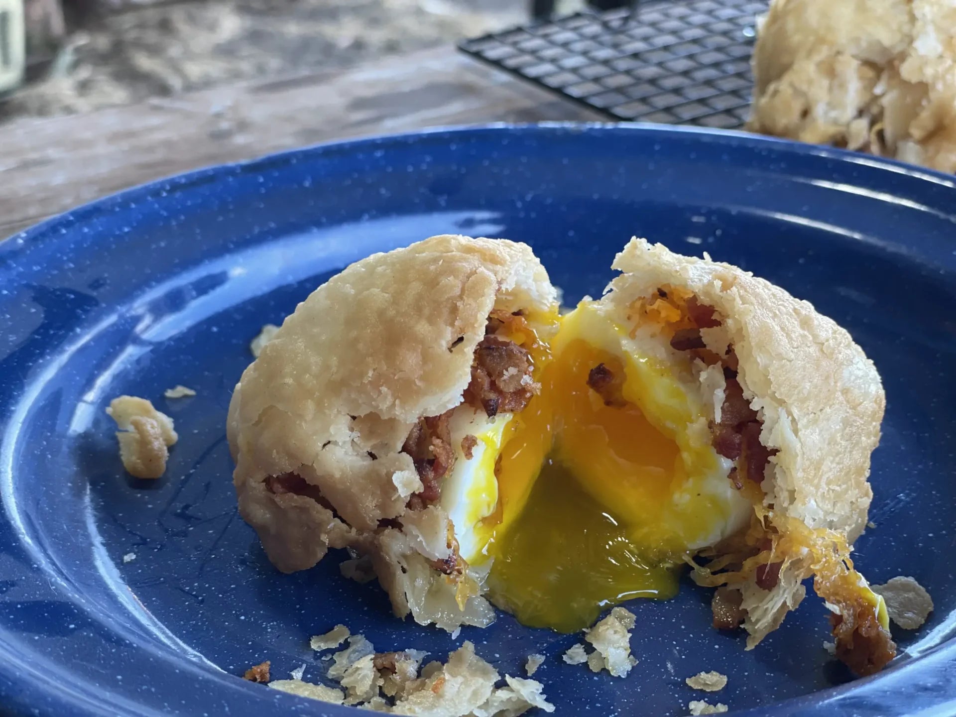 Spread a thin layer of crumbled, cooked bacon over each six-inch circle of pie dough. Add a thin layer of cheddar cheese on top and set a peeled egg on to each. Fold up the pie dough so it holds the ingredients inside without smashing the egg. Crimp all the edges at the top.