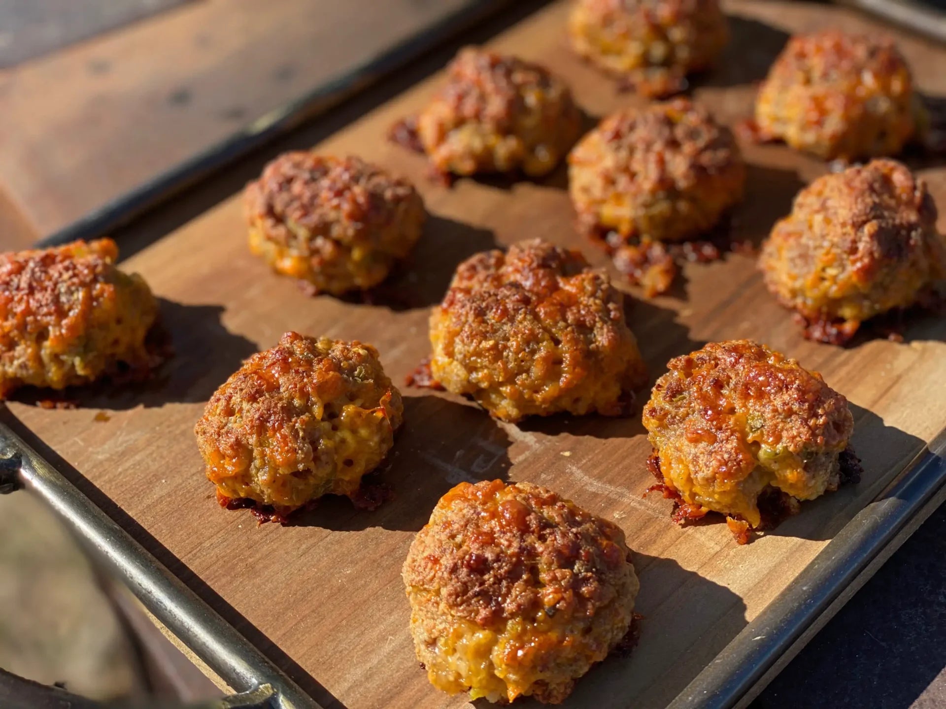 Whether you're cooking these sausages balls indoors or outdoors, be sure to place them on a sheet of parchment paper to keep them from getting too brown on the bottom.