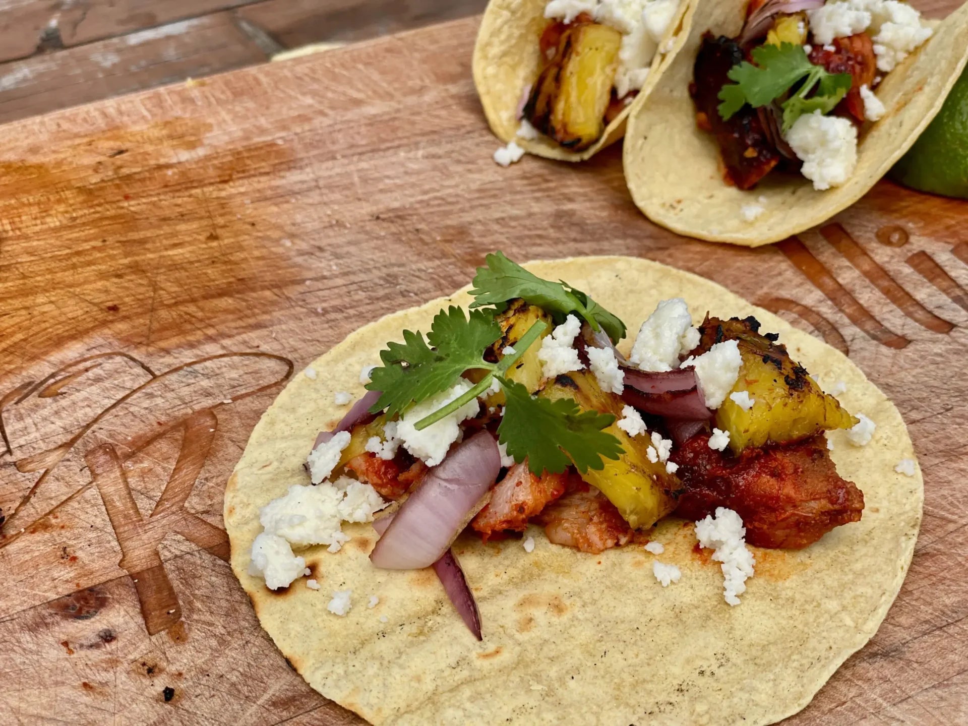 - Warm the corn tortillas on the grill. Top each tortilla with a large spoonful of the meat, pineapple, onions and top with queso fresco cheese, and cilantro, sprinkle with lime juice and serve.