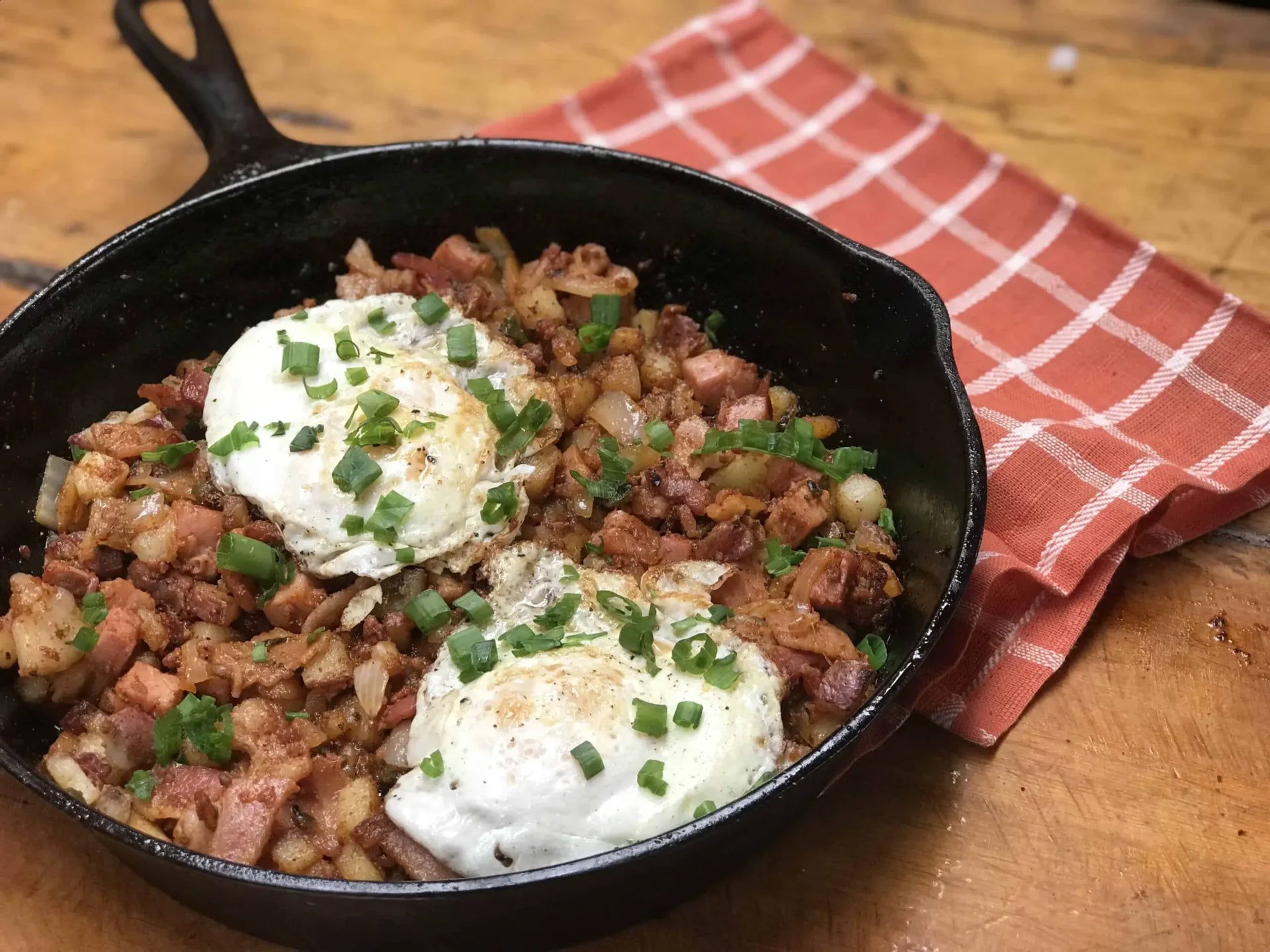 One of my favorite memories is going to a good breakfast diner and having a tasty hash with my family. Today, we're going to step it up from the traditional breakfast hash and we're going to use three different kinds of meat. This is a hearty one, folks - we got bacon, chorizo and ham in this bad boy. Meat! That's what I'm talking about so let's get after it!