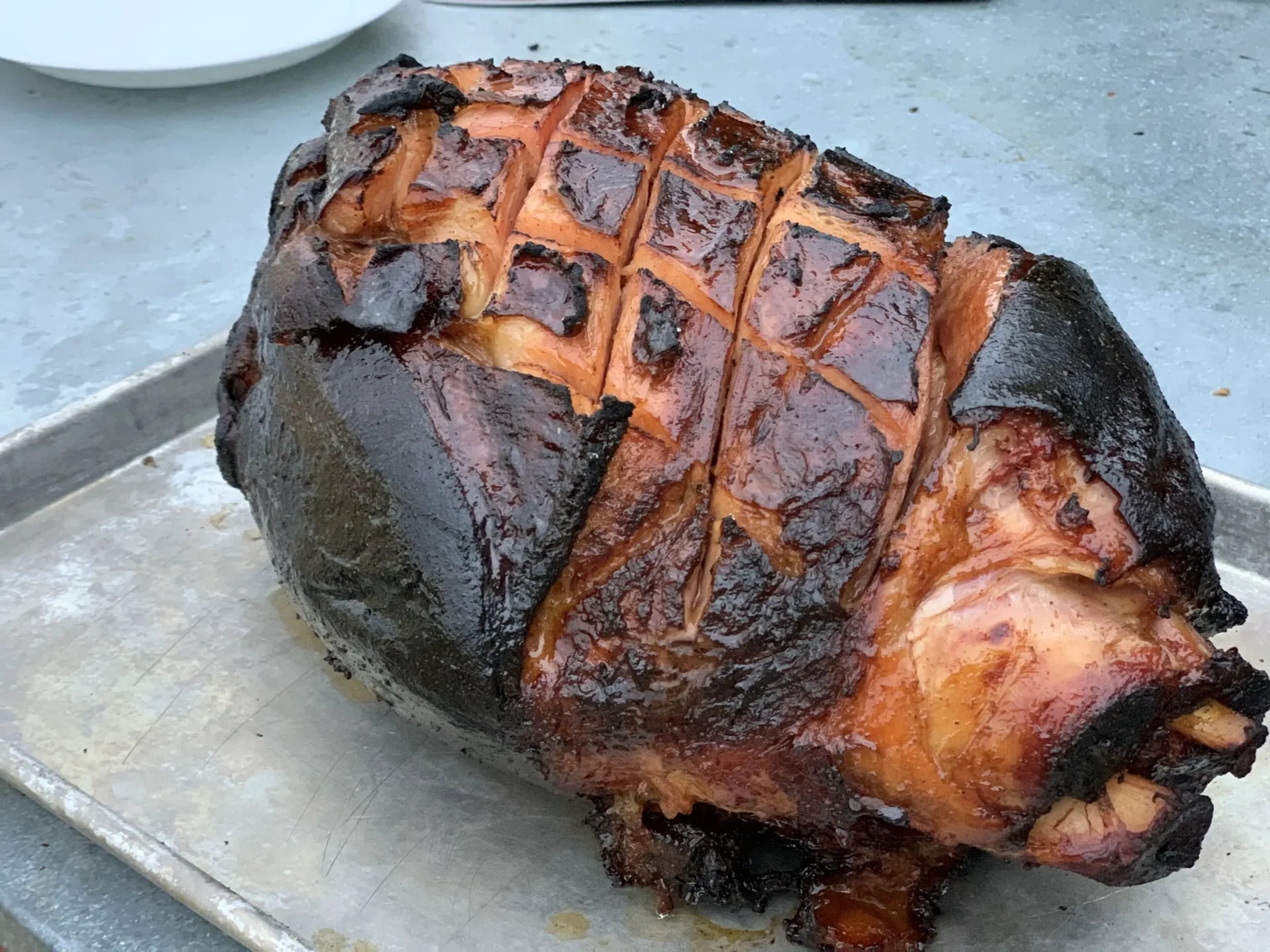 - Remove the ham from the smoker and place on a baking dish. Cover with foil and let rest for about 10 minutes. Slice the ham against the grain and serve warm.