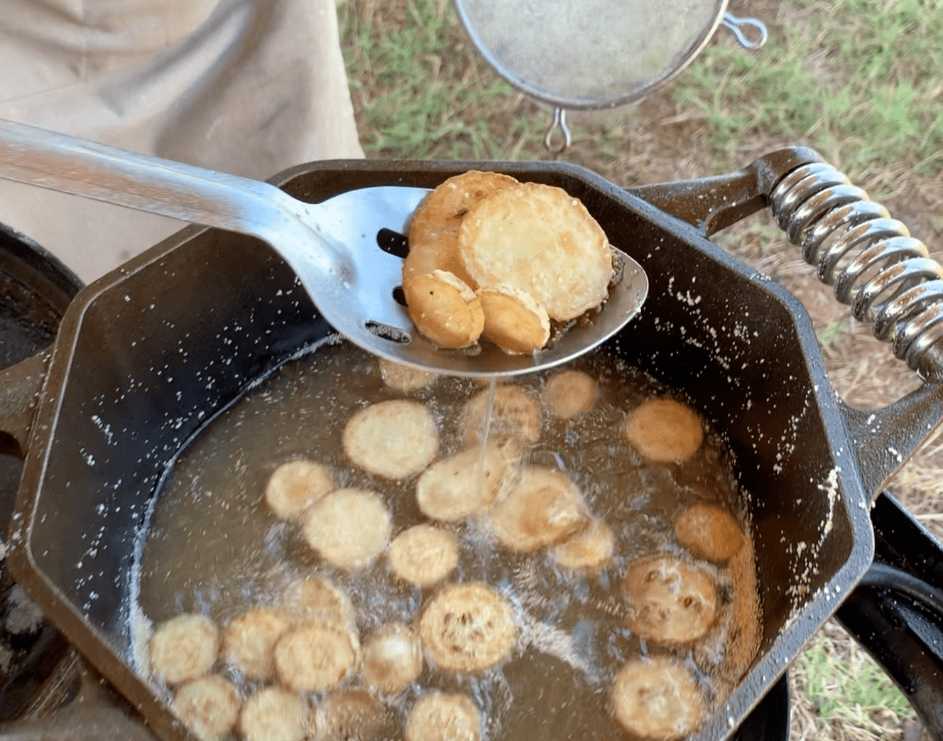 - Wash and slice the squash into about ⅛-thick slices. Separate the larger slices from the smaller ones and fry together according to size, for a more even frying.