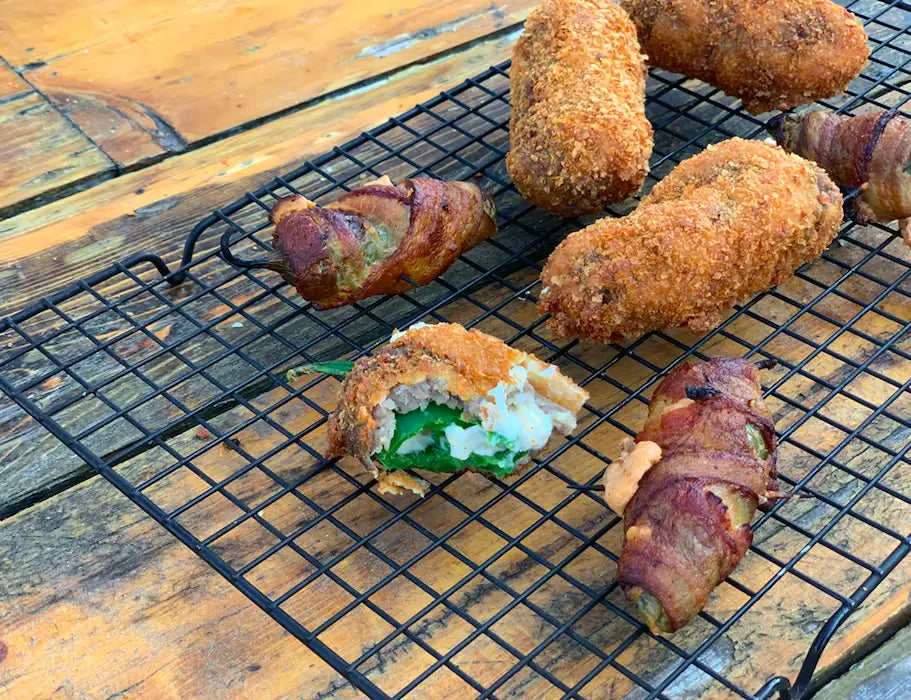 - Place the eggs in a bowl and roll the wrapped peppers in the egg wash then coat generously with the potato flakes. Repeat in the egg wash and potato flakes for a double coating.