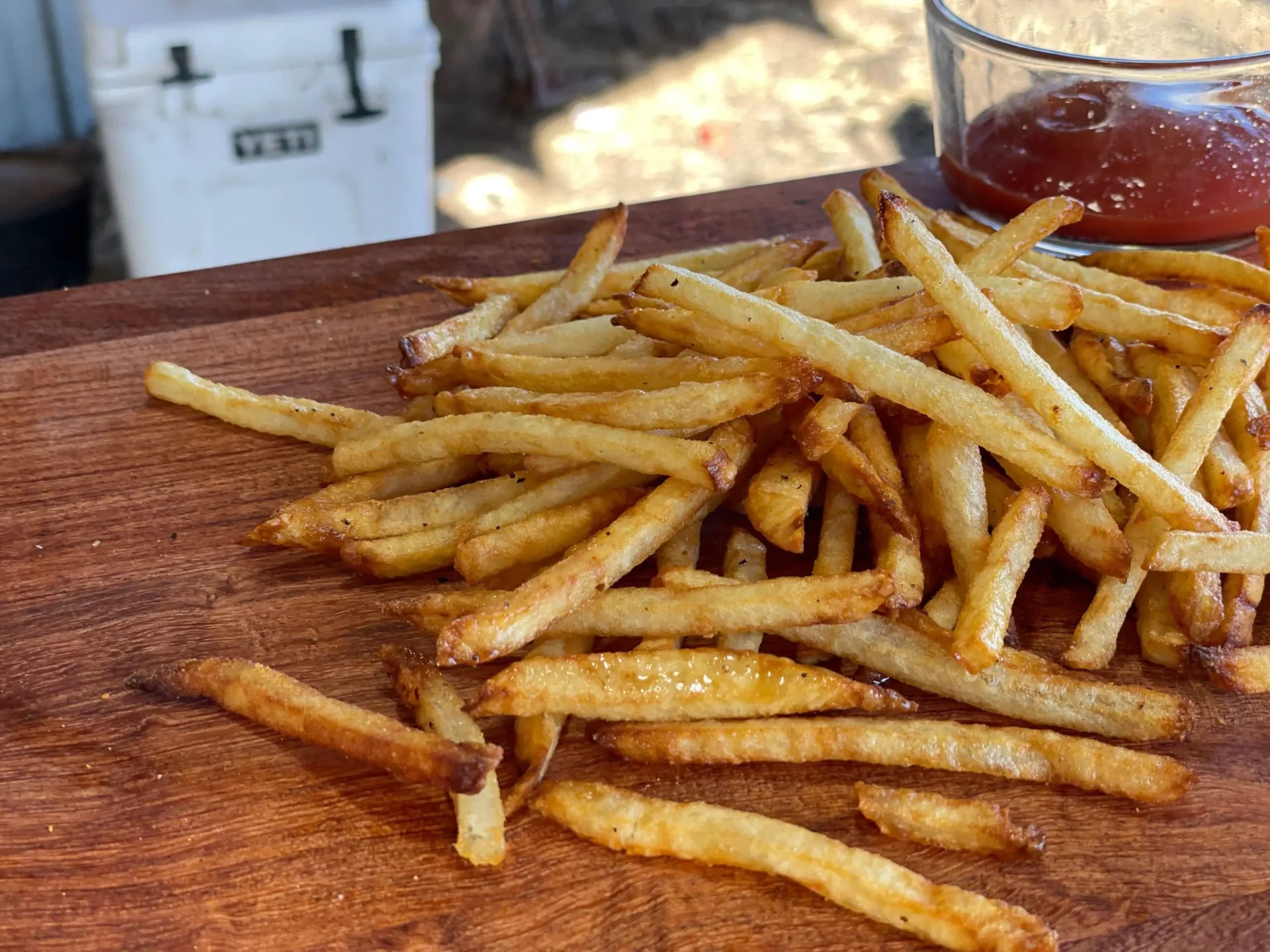 After five minutes, remove the fries and add a cup of lard to the canola oil. Bring the temperature to about 415 degrees and fry for just under a minute. These will turn golden and crispy before you can say Oklahoma.