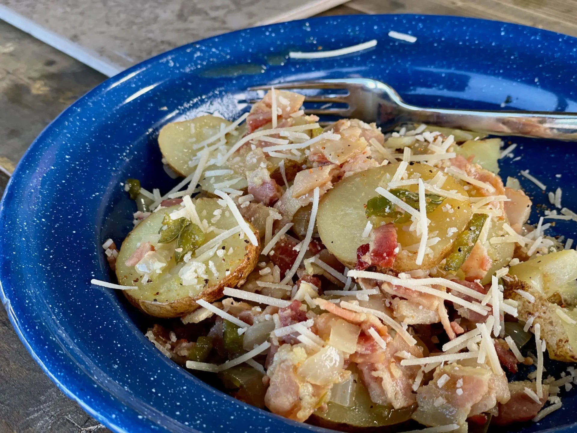 Yep, hillbilly taters are a one pot recipe! Grab a Dutch Oven or skillet and get that bacon cooking over the fire or on the stove. When bacon is tender, add the jalapenos and onion. Cook until tender.