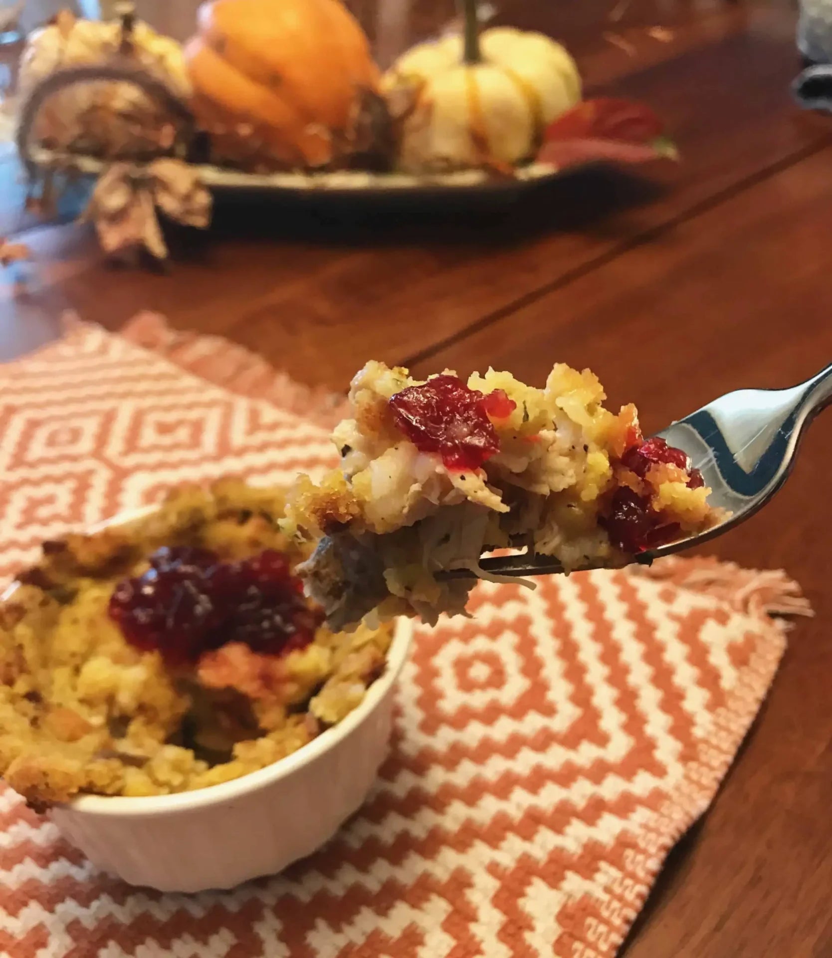 Get creative! This recipe will work with any layered combination of leftovers you have: Green beans, Turkey with Gravy Sweet Potatoes, Turkey and Cranberry, etc. Instead of a stuffing crust you can also use canned biscuits rolled out thinly and placed in the ramekin.