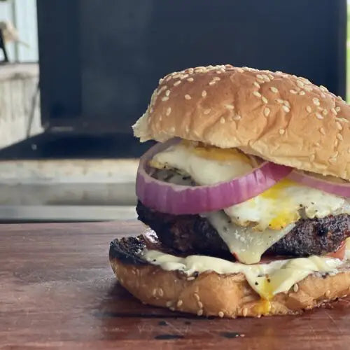 - To assemble the burgers: spread mayonnaise on the bottom buns, followed by a slice of tomato, burger patty, fried egg, onions and top bun. Serve immediately.