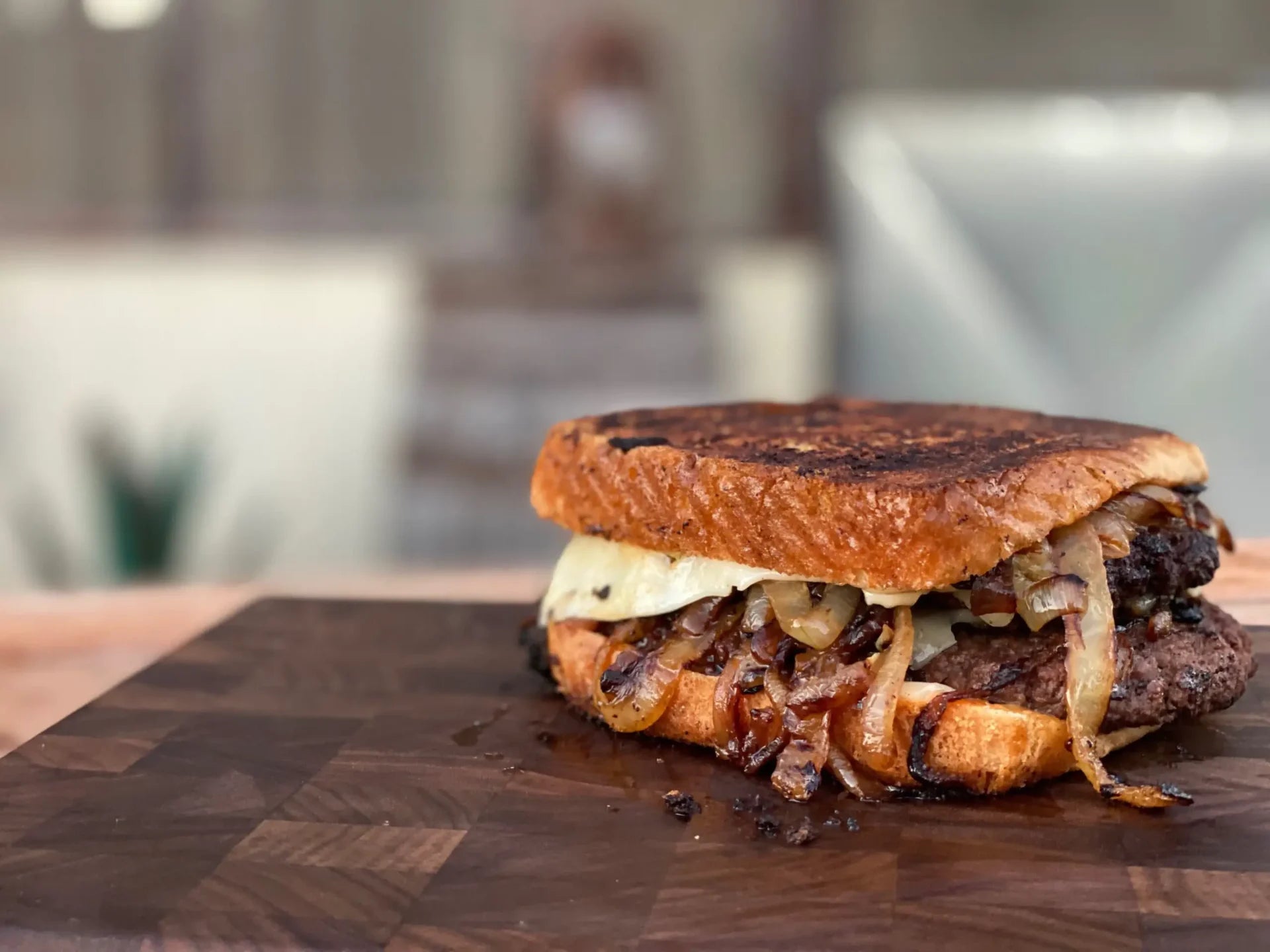 - Spread a generous amount of the sauce on 2 pieces of the bread. Top 1 slice with a slice of Swiss cheese, onions, pepper jack cheese, burger patty, onions and top with the remaining bread slice.