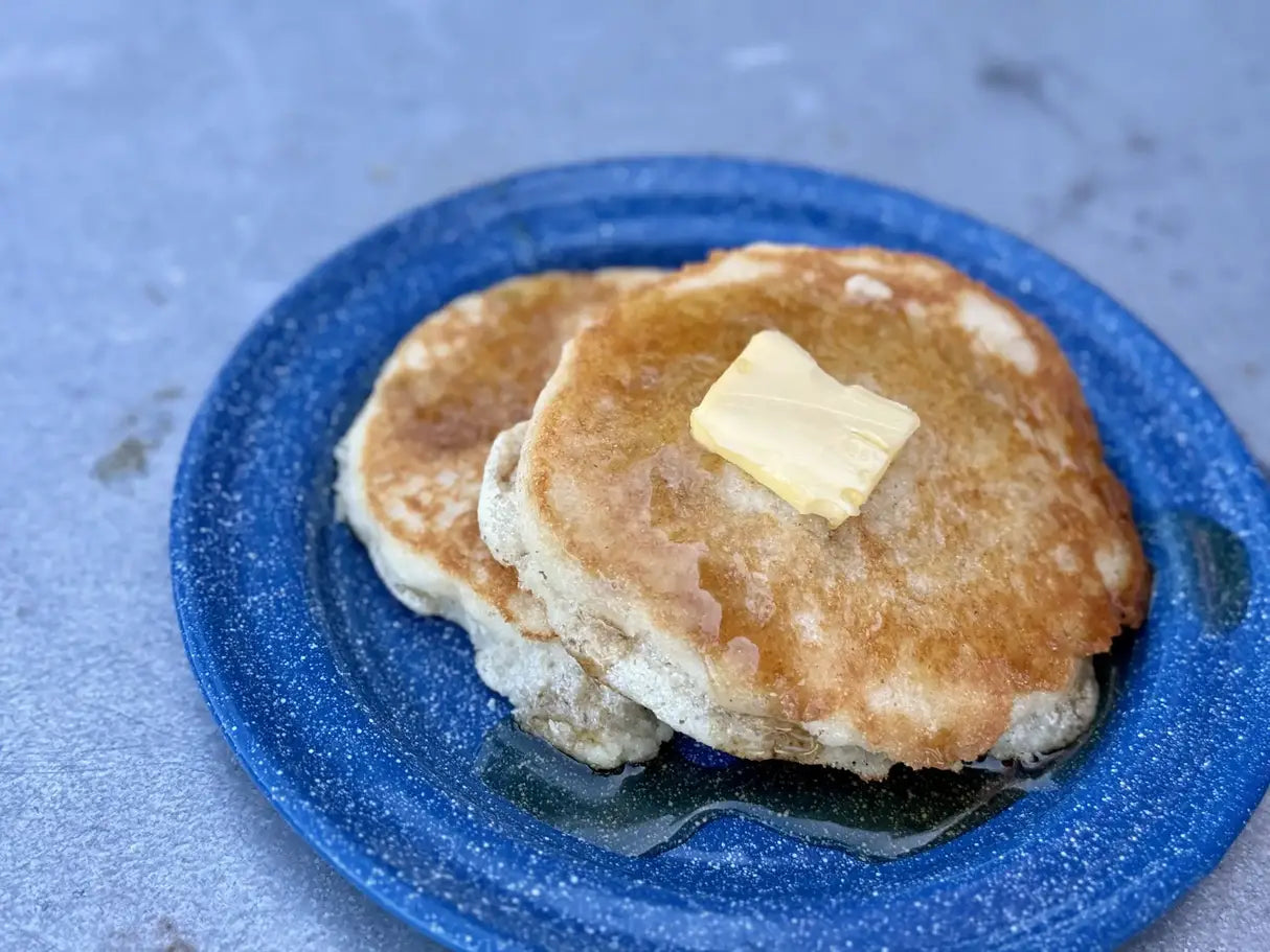 Oil your skillet and use about 1/3 cup of batter per hoecake. Flip after three minutes or after the cake turns golden brown on one side. Serve with butter, molasses, maple syrup, or simple syrup – these would have been the available toppings 250 years ago.