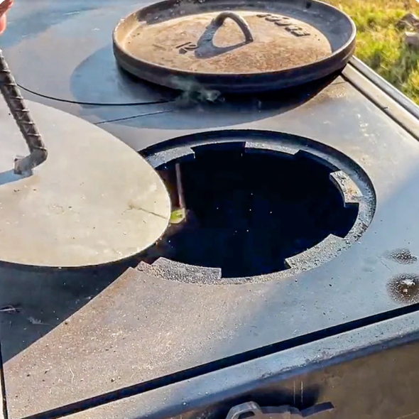 Our signature wood-burning stove, affectionately named Bertha, is the centerpiece of cowboy cooking style. Made by hand in Tulsa, Oklahoma of 1/4" and 3/16" heavy-duty, corten steel, this stove will last a lifetime. Corten is specially designed to surface rust and self-seal, creating a rustic outer shell without affecting the integrity of the steel. High quality welds, craftsman tooling marks, and raw ingenuity proudly patina this functional showpiece. No two stoves are exactly alike, and years of use will provide you with some cowboy stories of your own to tell family and friends.