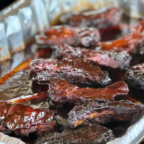 - Remove the foil from the pan and let them cook for another 30 minutes. Place the ribs on a platter and pour the sauce from the foil pan over the ribs. Serve.