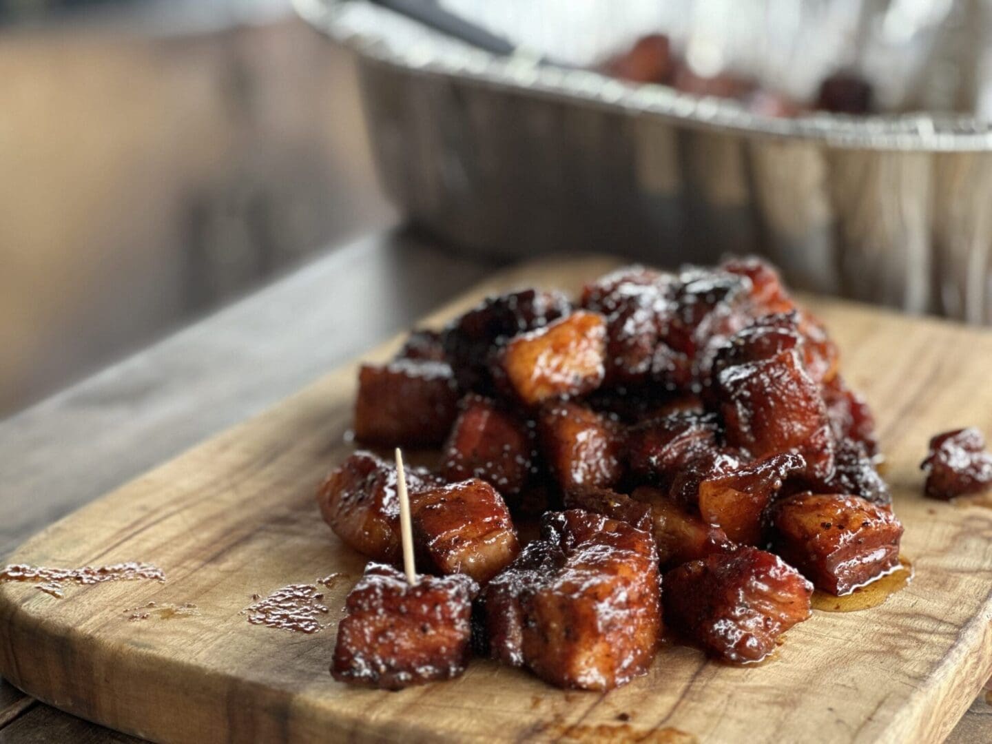 9. Remove the tinfoil from the pan and pour the glaze over the pork belly cubes, and stir to coat. Smoke, uncovered, for 15 minutes. Remove from the heat and let cool slightly before serving.