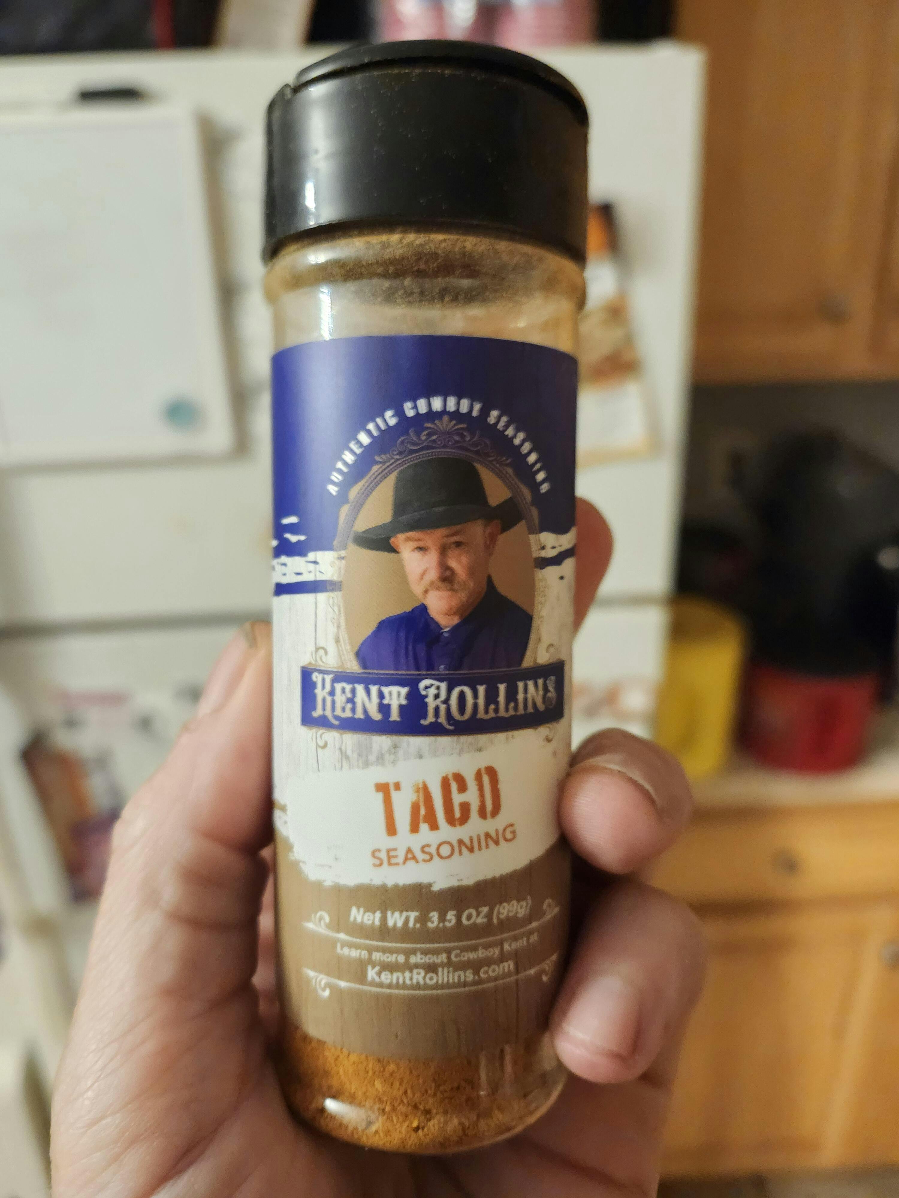 Kent Rollins Taco Seasoning 3.5 oz jar.