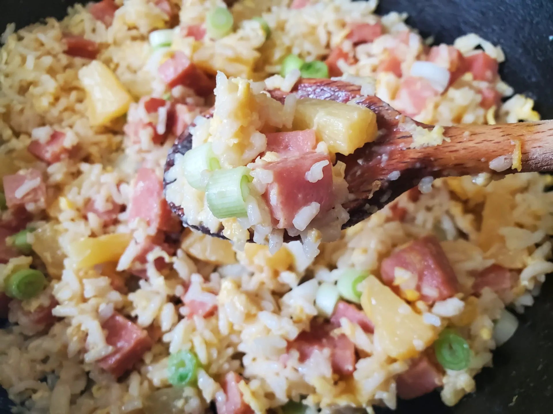 Add the olive oil to the skillet and heat. Add the eggs to the skillet and stir to scramble. Once the eggs start to cook, stir in the rice. Stir constantly until the eggs are nearly done. Stir in the spam and pineapple.