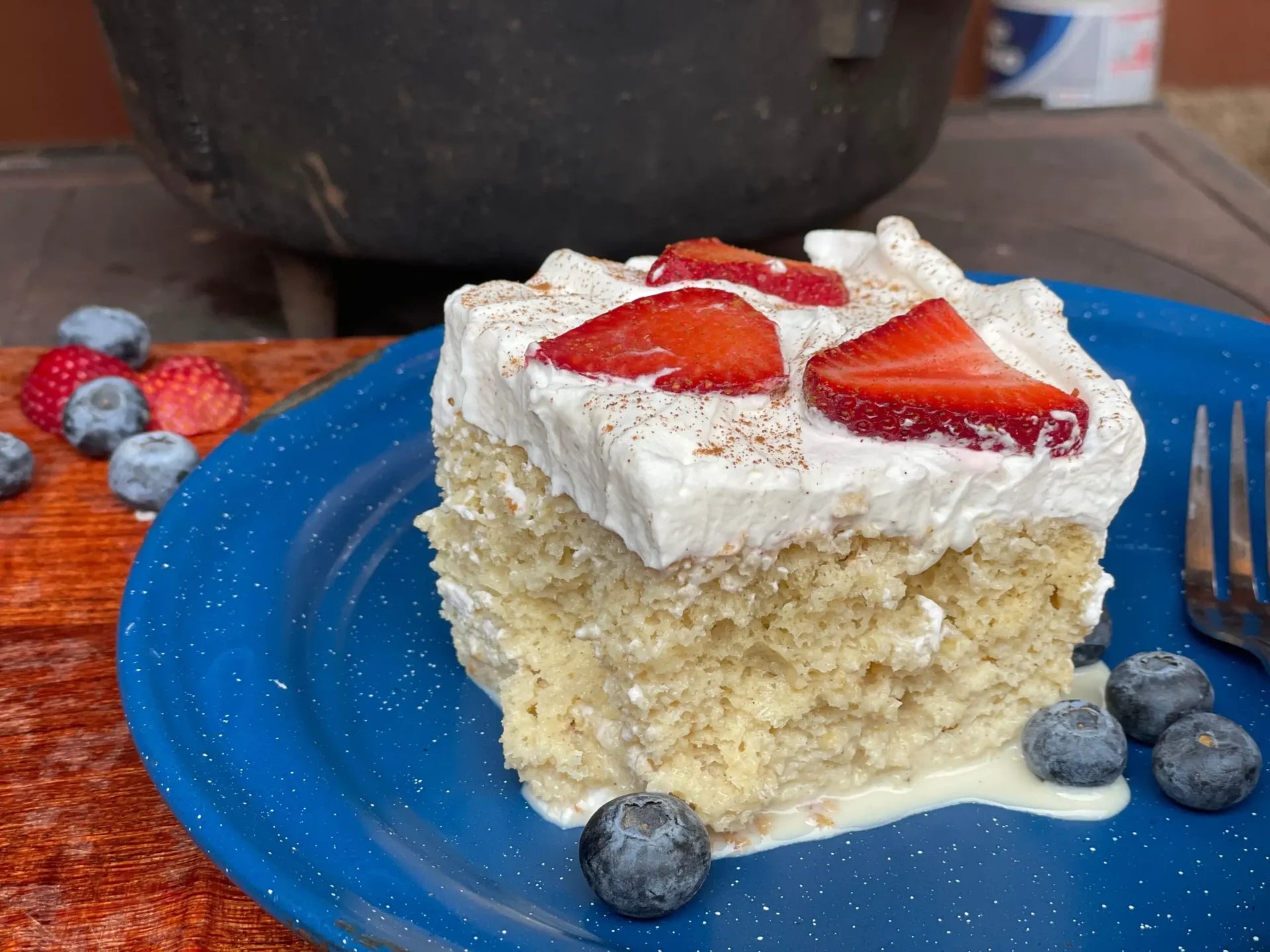 Grease and flour the pan well. If you're using a cast iron Dutch oven, don't pre-heat it, just make sure it's room temperature or a tad warmer. If you're cooking indoors, use a 9 by 13 baking dish and cook at 350 for 20 minutes or until you can poke the cake with a toothpick and it'll come out clean. If you're cooking on coals, use a high trivet. Place coals around the outside of the Dutch oven and all over the lid. Rotate the pan and the lid at opposite directions every few minutes to ensure the cake will be baked evenly.